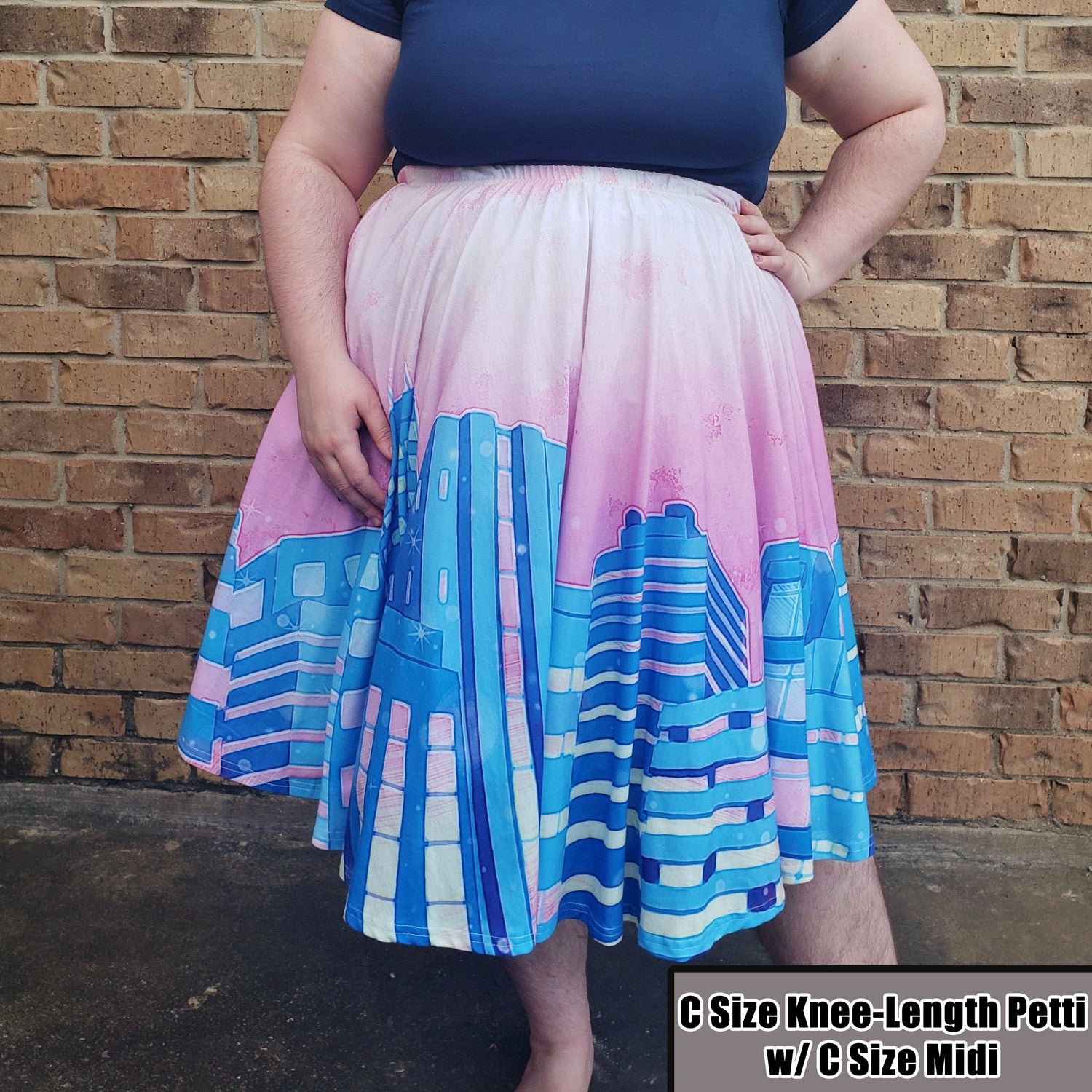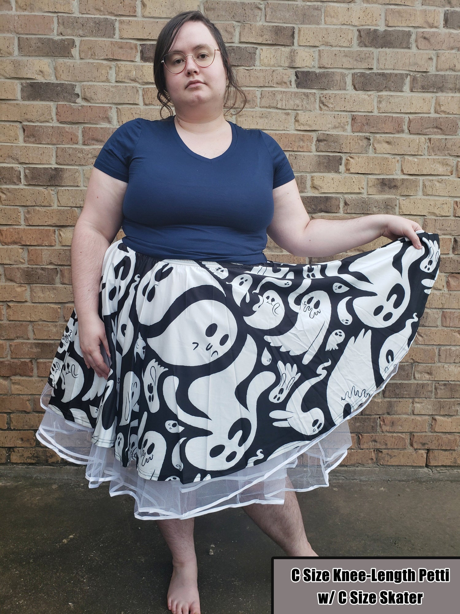 Petticoat A-D Sizes generally align with Skirt A-D Sizes, but the exact waist measurement ranges differ slightly due to the different type of stretch in the fabric and waistband. Check the sizing chart to be sure which size will work best for you.