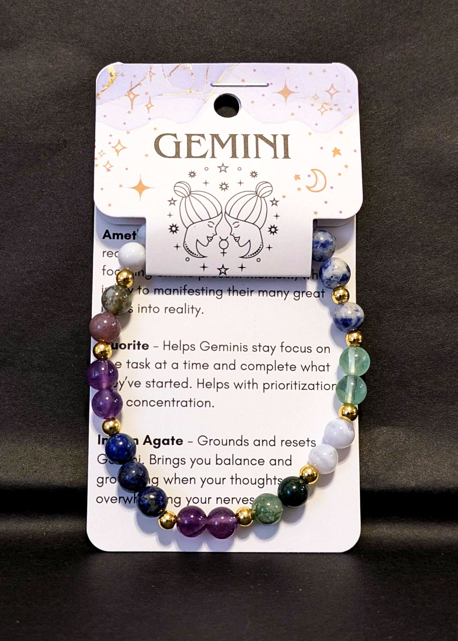 This bracelet is designed with 6 different crystals that resonate with the traits of Gemini, or enhances the energies that the Gemini Zodiac sign needs improvement on to live to their fullest potential. Comes with a card containing a short description of each crystal and their properties.*
