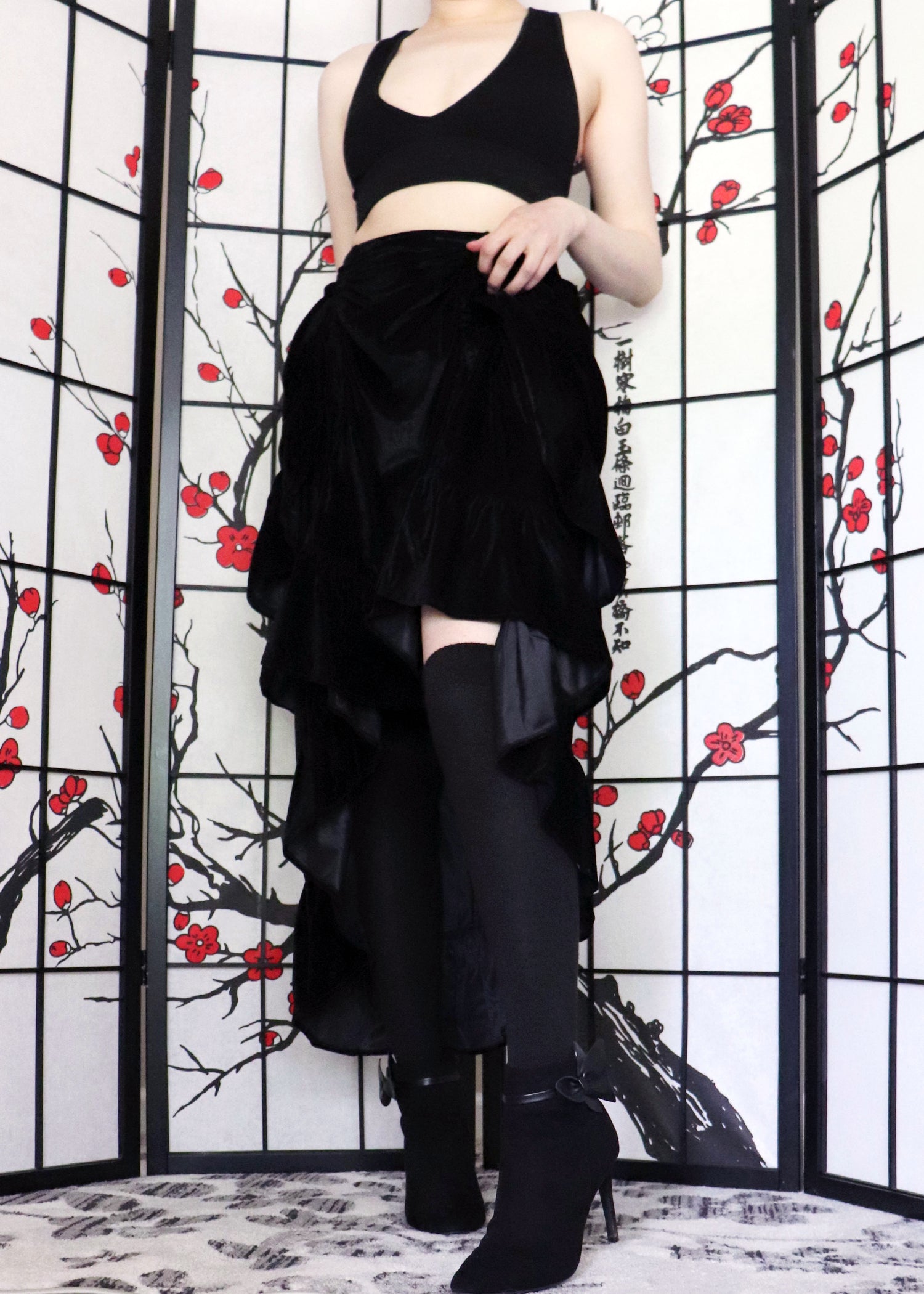 A black velvet, adjustable high/low skirt for all your dark witchy fit needs.