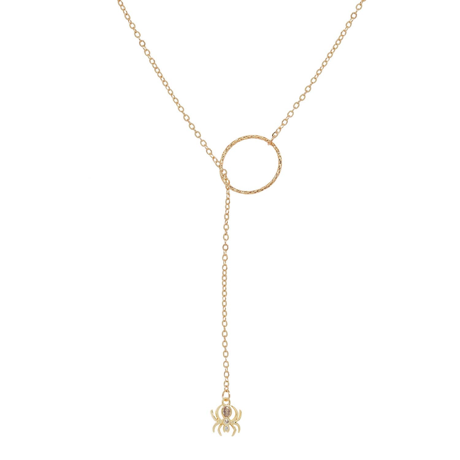 A dainty crystal-studded spider charm dangles from golden stainless steel chain, sliding through a gold loop. It's a lariat, but different. The ultimate in customizable. The Spider represents creativity, femininity, strength and patience. Just as the spider must slowly and carefully build her web, we can build and create our own fate. She is a reminder that we determine our own path and that, even if the web is destroyed, we have the toold within us to build another.
