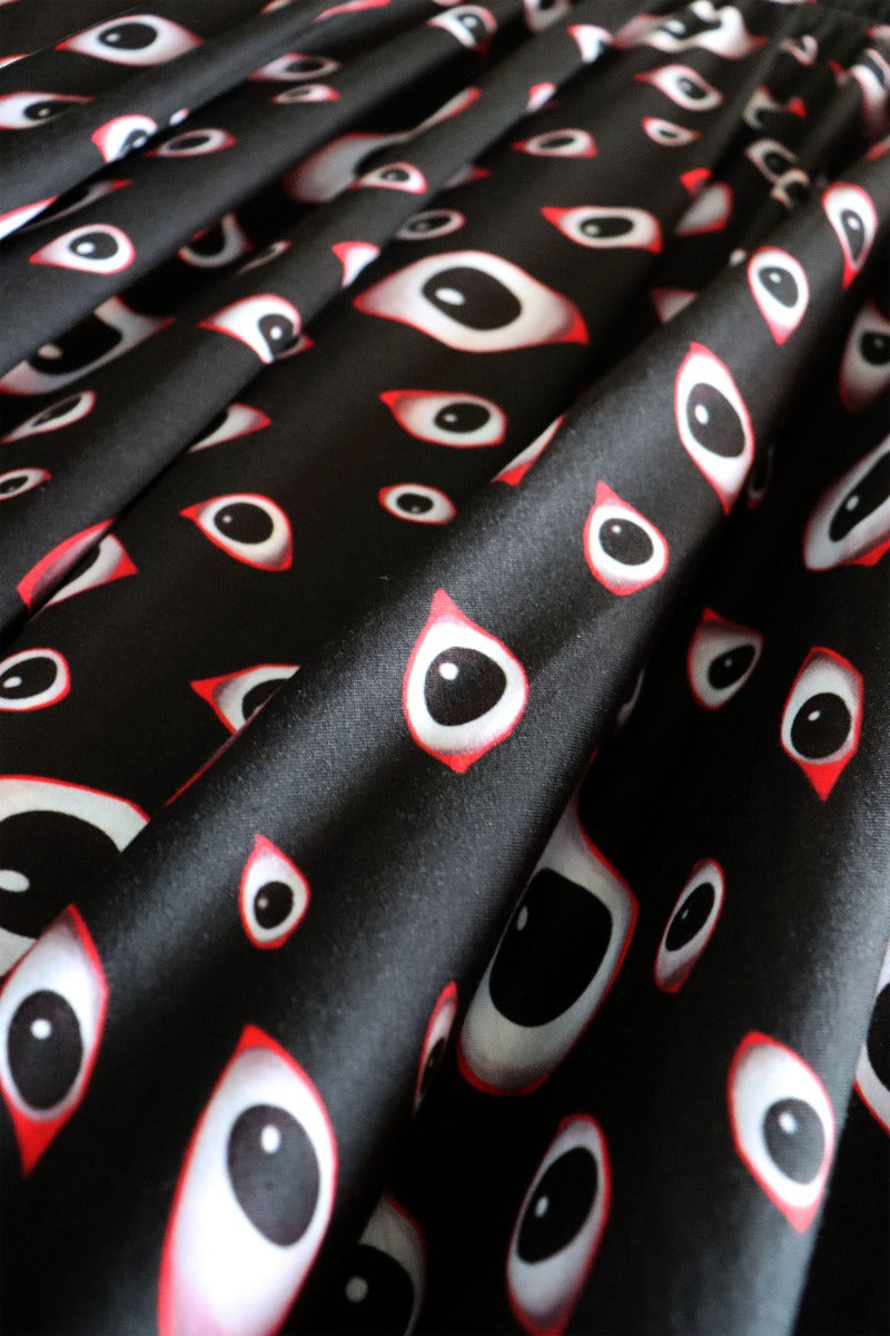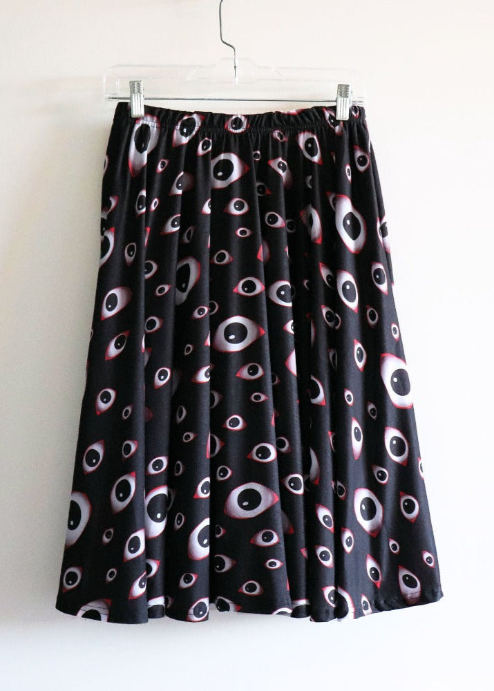 An all-over creepy eyeball pattern on an ultra comfortable midi skirt.