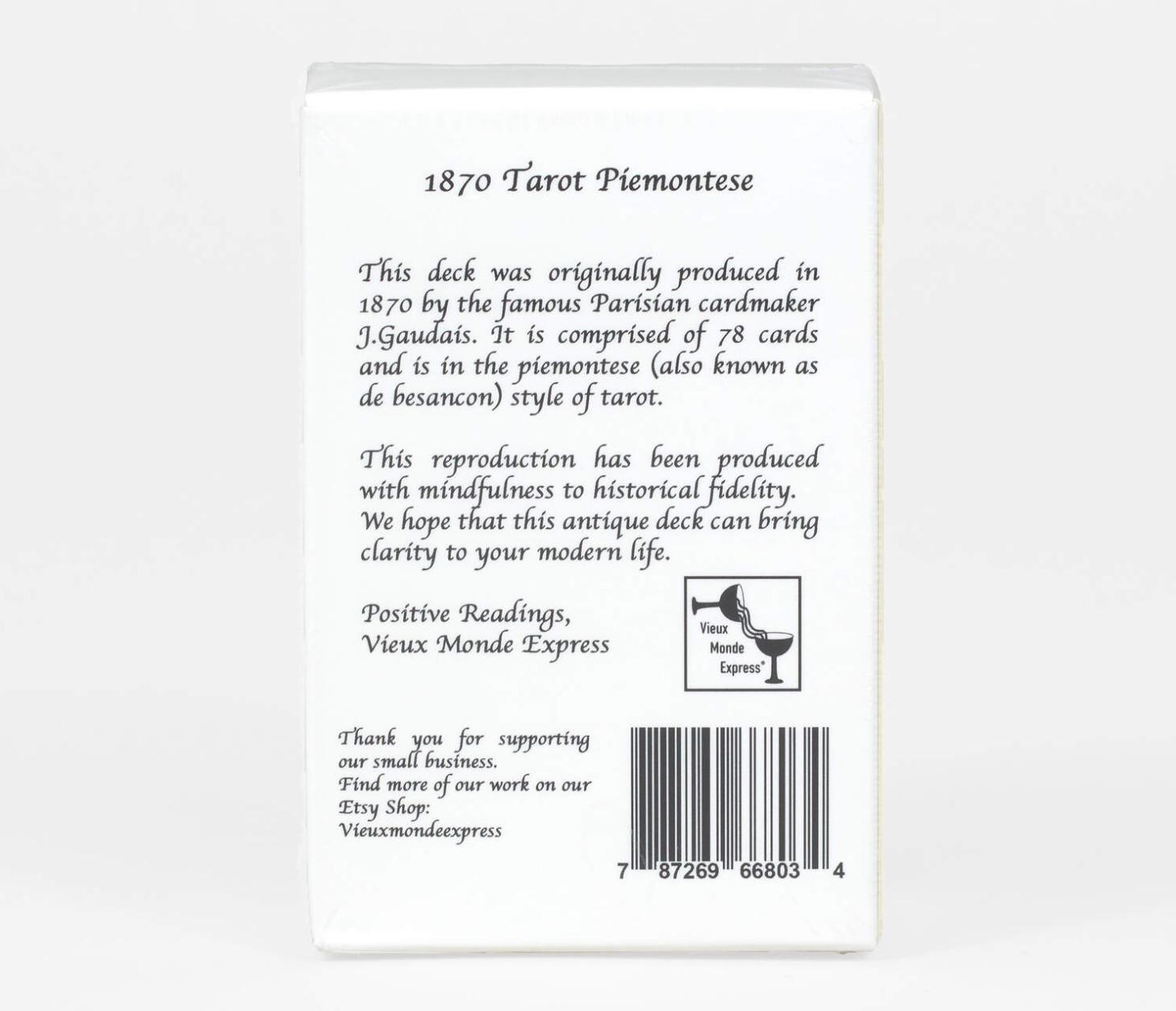 It is comprised of 78 cards and is in the piemontese (also known as de besançon) style of tarot. This reproduction has been produced with mindfulness to historical fidelity. We hope that this antique deck can bring clarity to your modern life. Bridge sized cards (2.25" x 3.5").