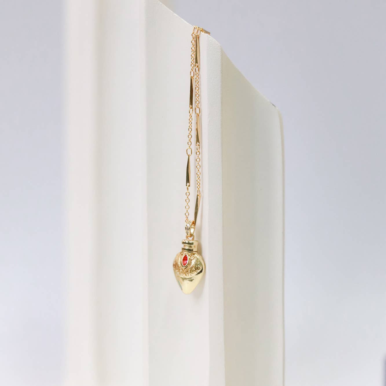 A gold potion bottle necklace fit for a court Witch. The bottle has a large red CZ crystal in the center. It hangs from a gold plated bar chain. It's as though you brewed a potion, and carry it around your neck for protection as you navigate life in the royal court.