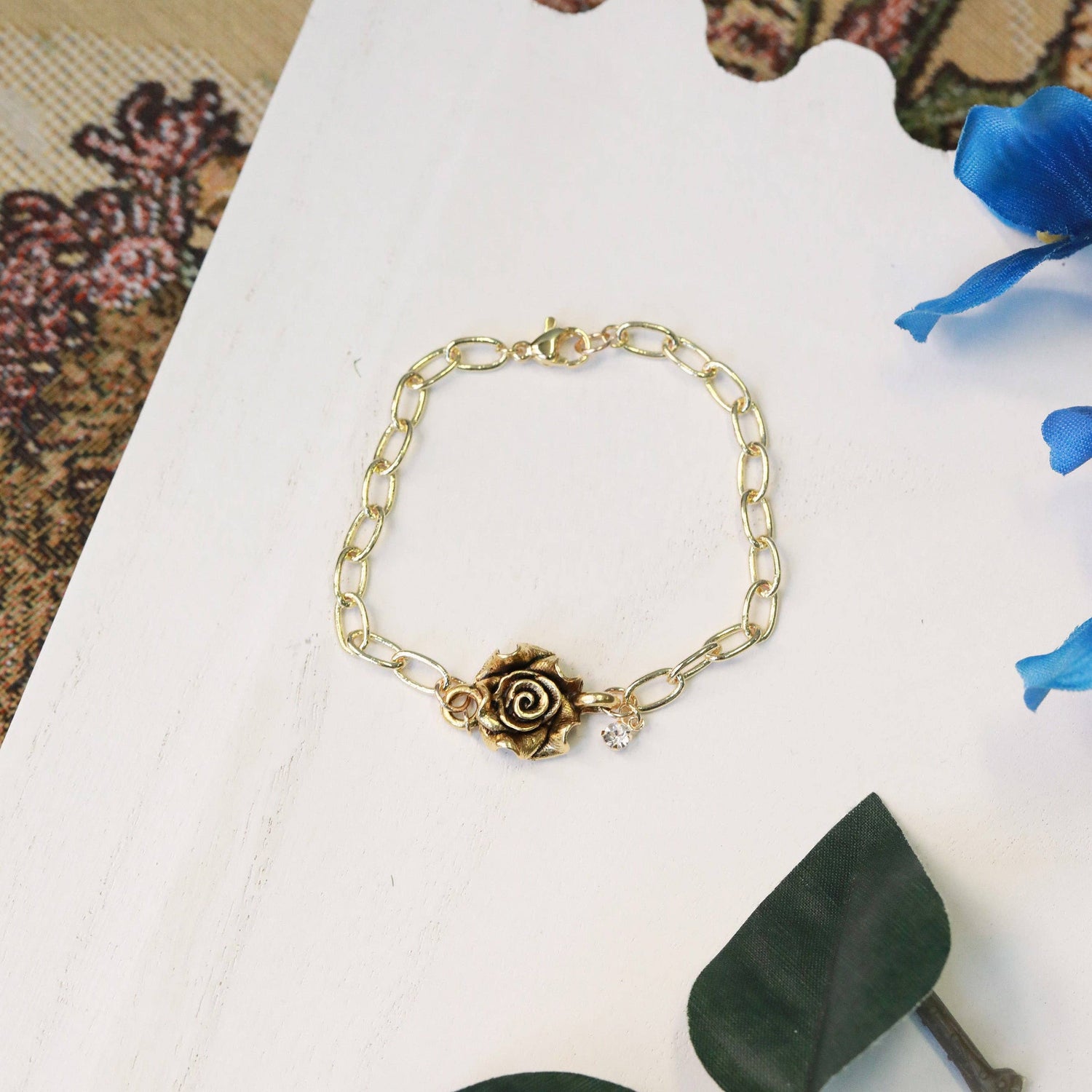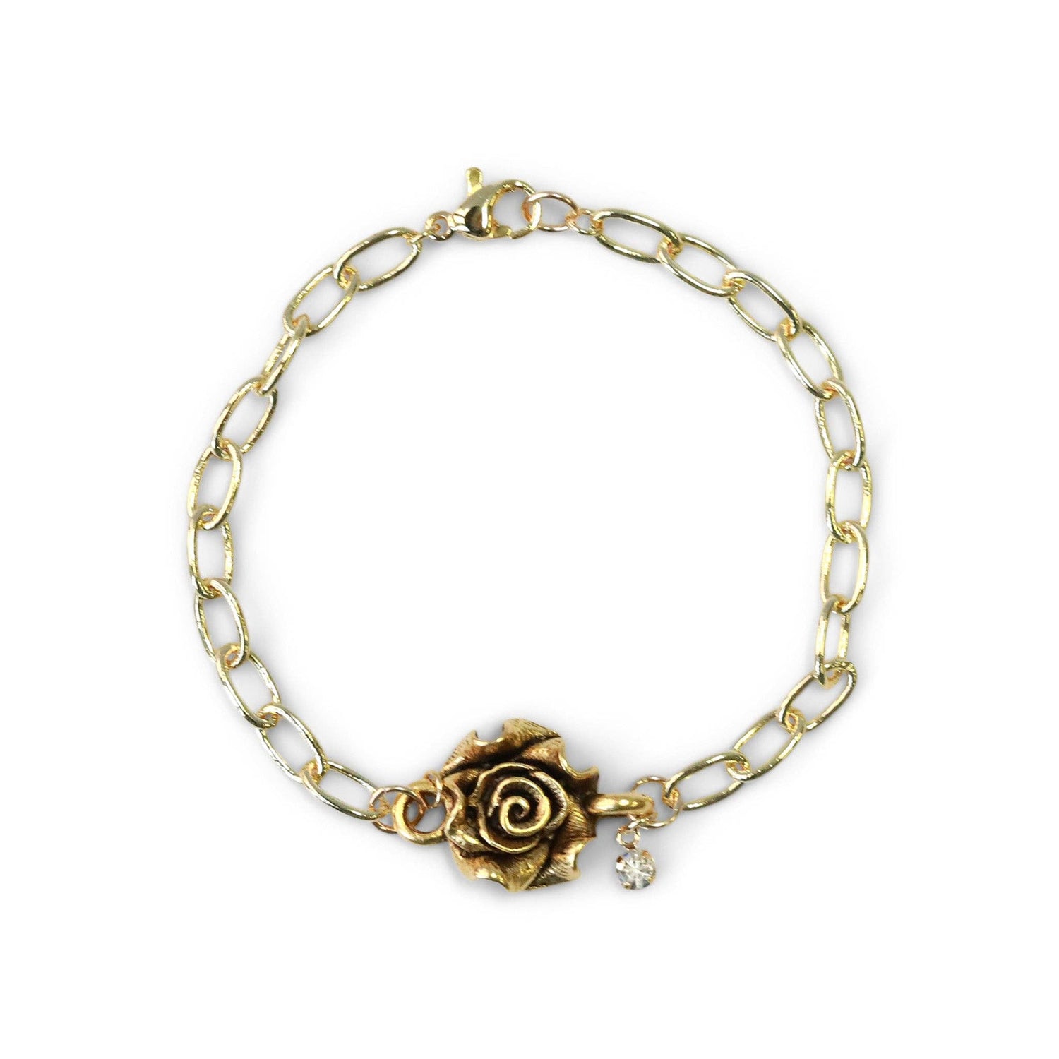A gold-plated chain link bracelet with a swarovski crystal-embellished rose connector at the center. A tiny crystal charm hangs on one side for a bit of sparkle.