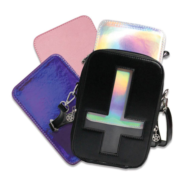 Sling your sins over your shoulder and carry them with you wherever you go with this unbelievably sick Inverted Cross Body Bag. The cross is a clear panel meant to show off an insert. We've included three different inserts you can switch out so your bag can change with your mood, or to alter your appearance in hopes to evade the Inquisition (results not guaranteed). Includes Matte Pink, Holo Purple, and Silver inserts.