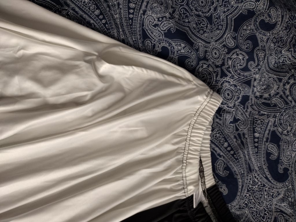 A note about white clothing: like many white fabrics, large white areas on this design are less opaque than our usual dark offerings. Nude undergarments or a white petticoat are recommended, as dark or bright colors will show through slightly. The model shown here is wearing Thigh Society "The Staple" shorts in beige underneath this skirt, which work perfectly!
