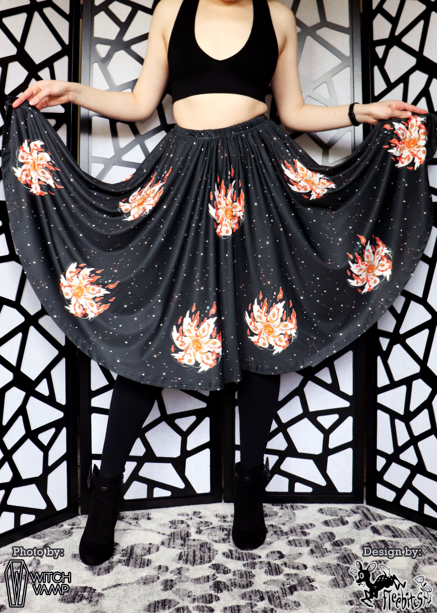 This is a soft, stretchy-waistbanded mid-calf skirt. Very flowy and elegant, this skirt is sure to impress! It has deep pockets that can fit a large phone or wallet.