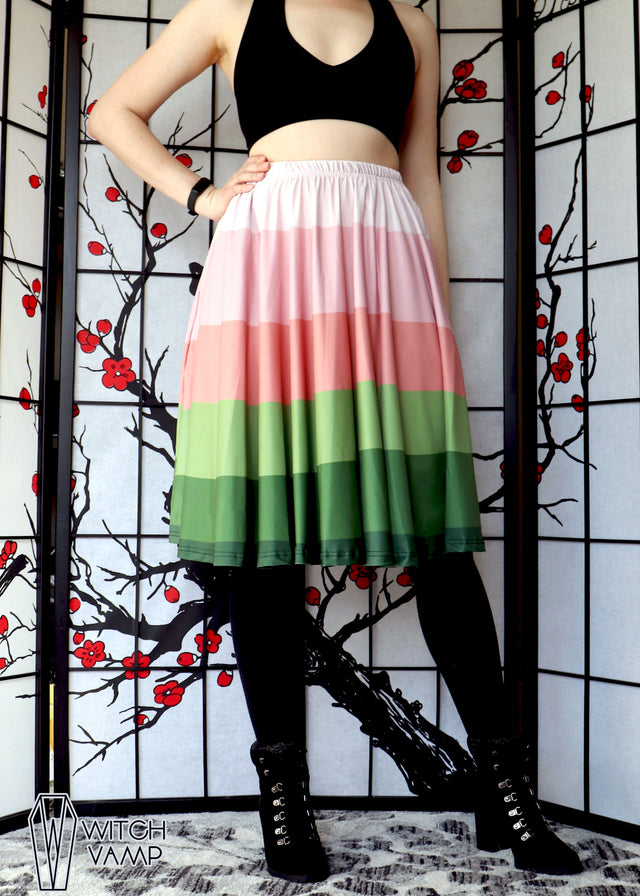 This is a soft, stretchy-waistbanded mid-calf skirt. Very flowy and elegant, this skirt is sure to impress! It has deep pockets that can fit a large phone or wallet.