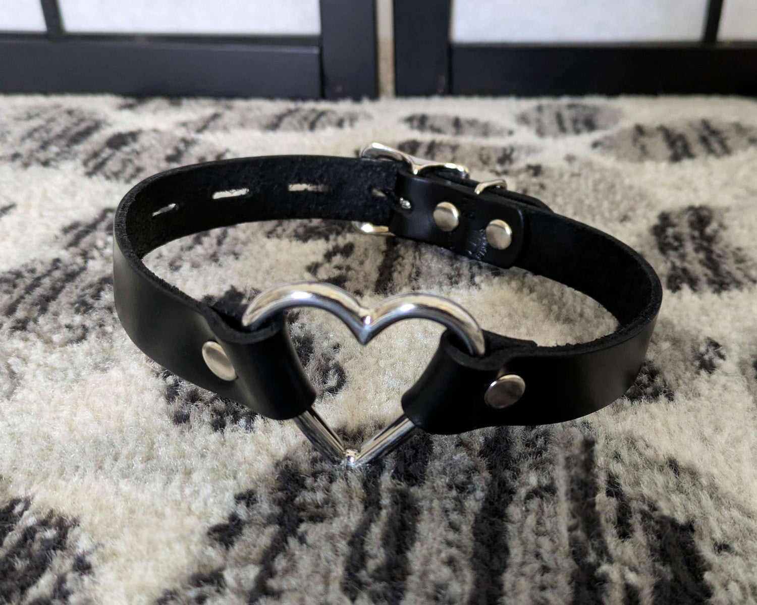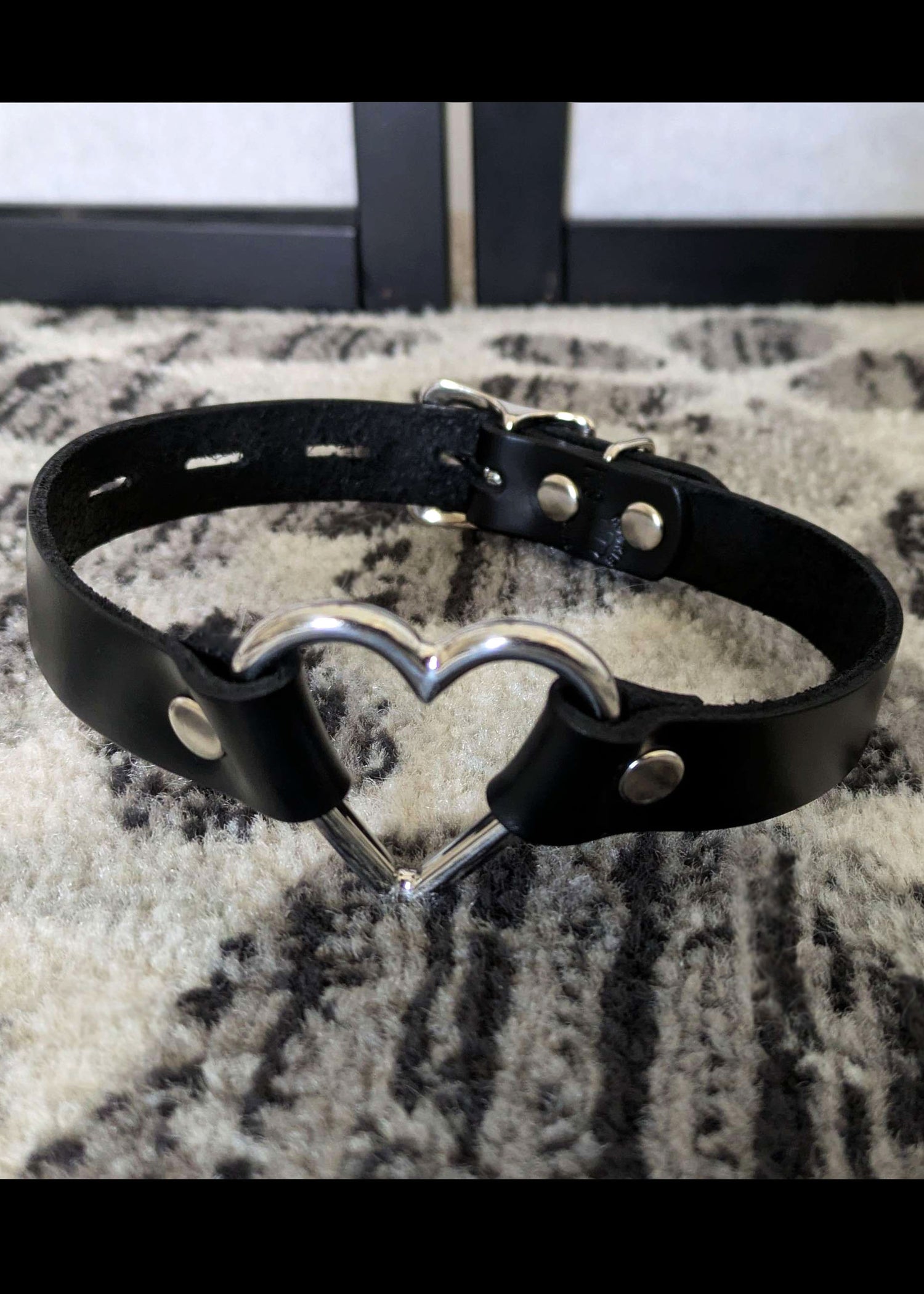 Black leather collar featuring a cute heart shaped metal accent piece.