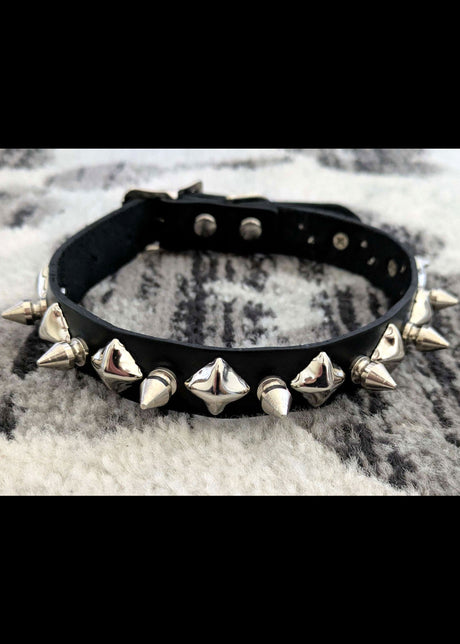 Black Leather Collar with Chrome Spikes and Pyramid Studs