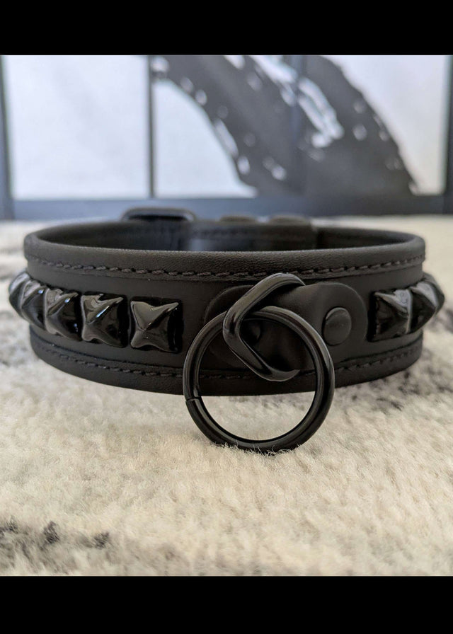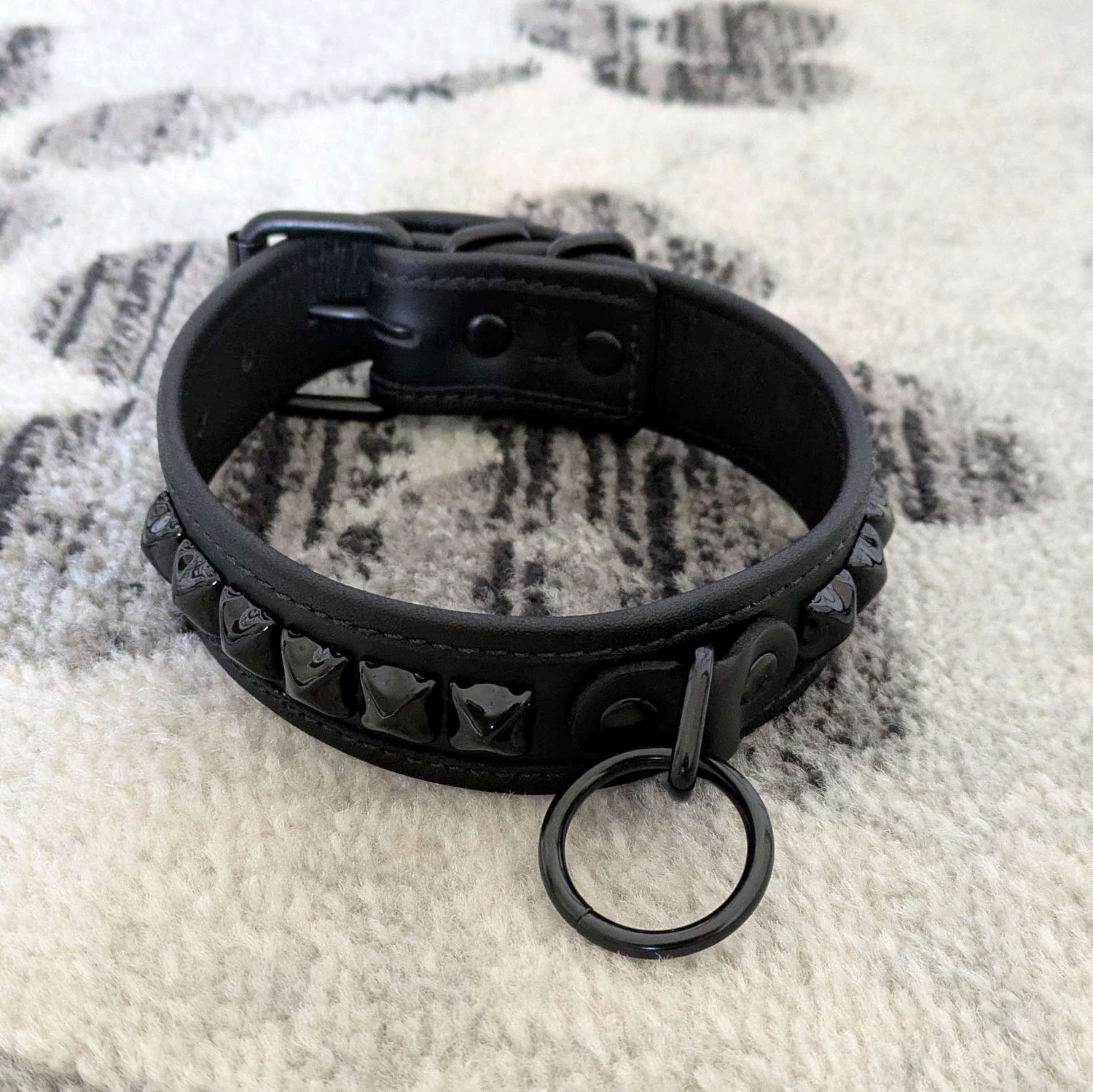 Thick Black Leather Collar with Black Pyramid Studs and Ring