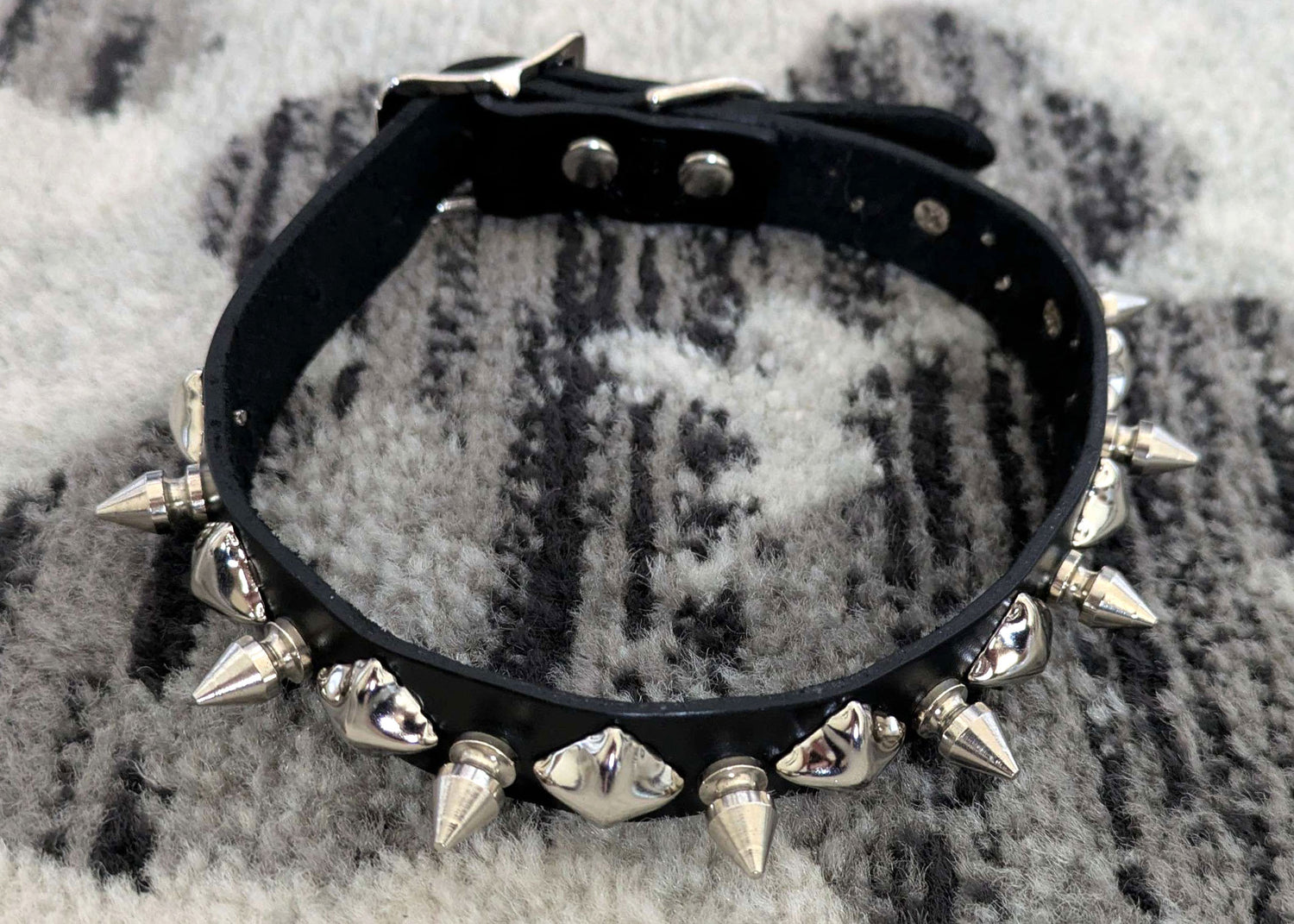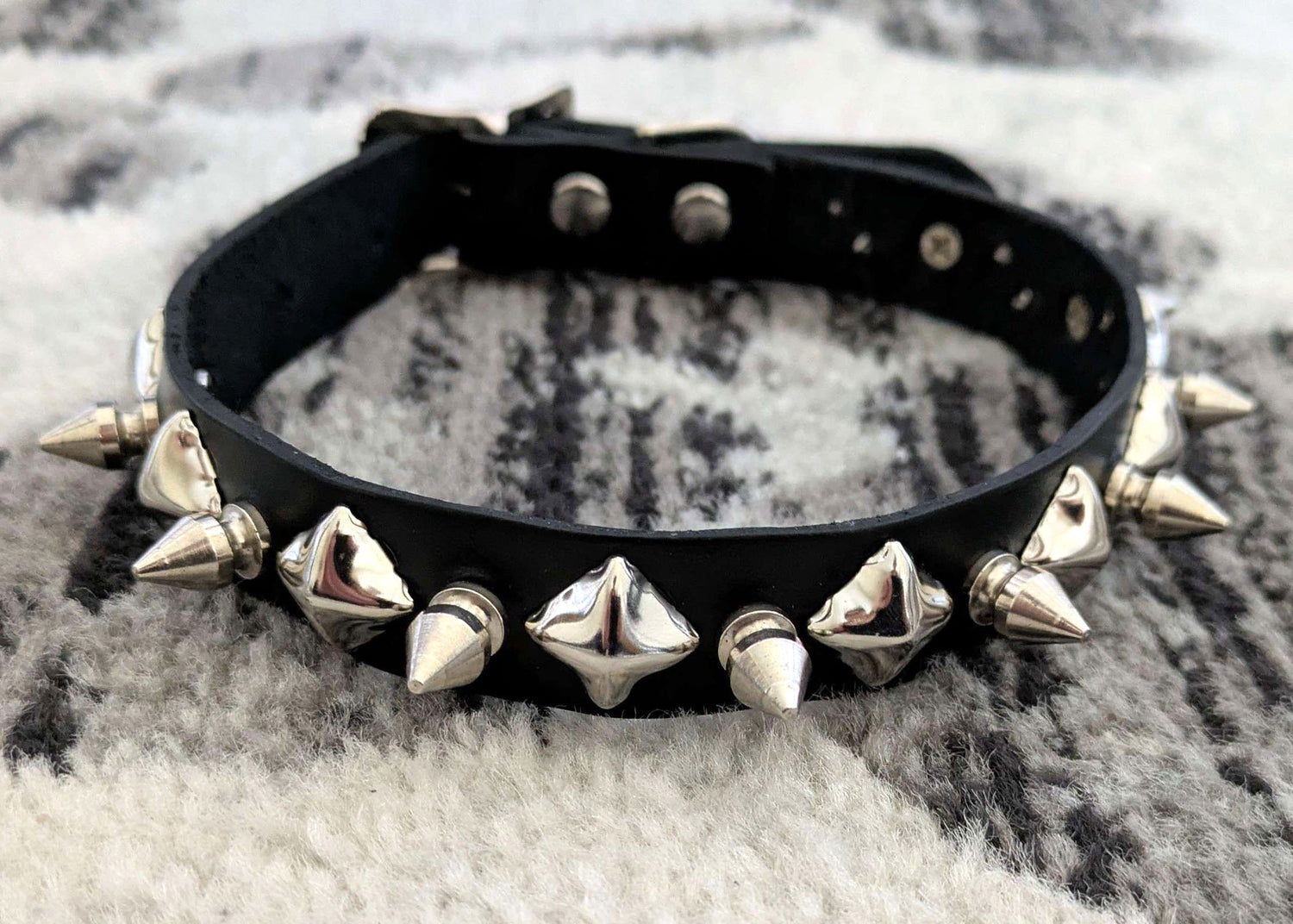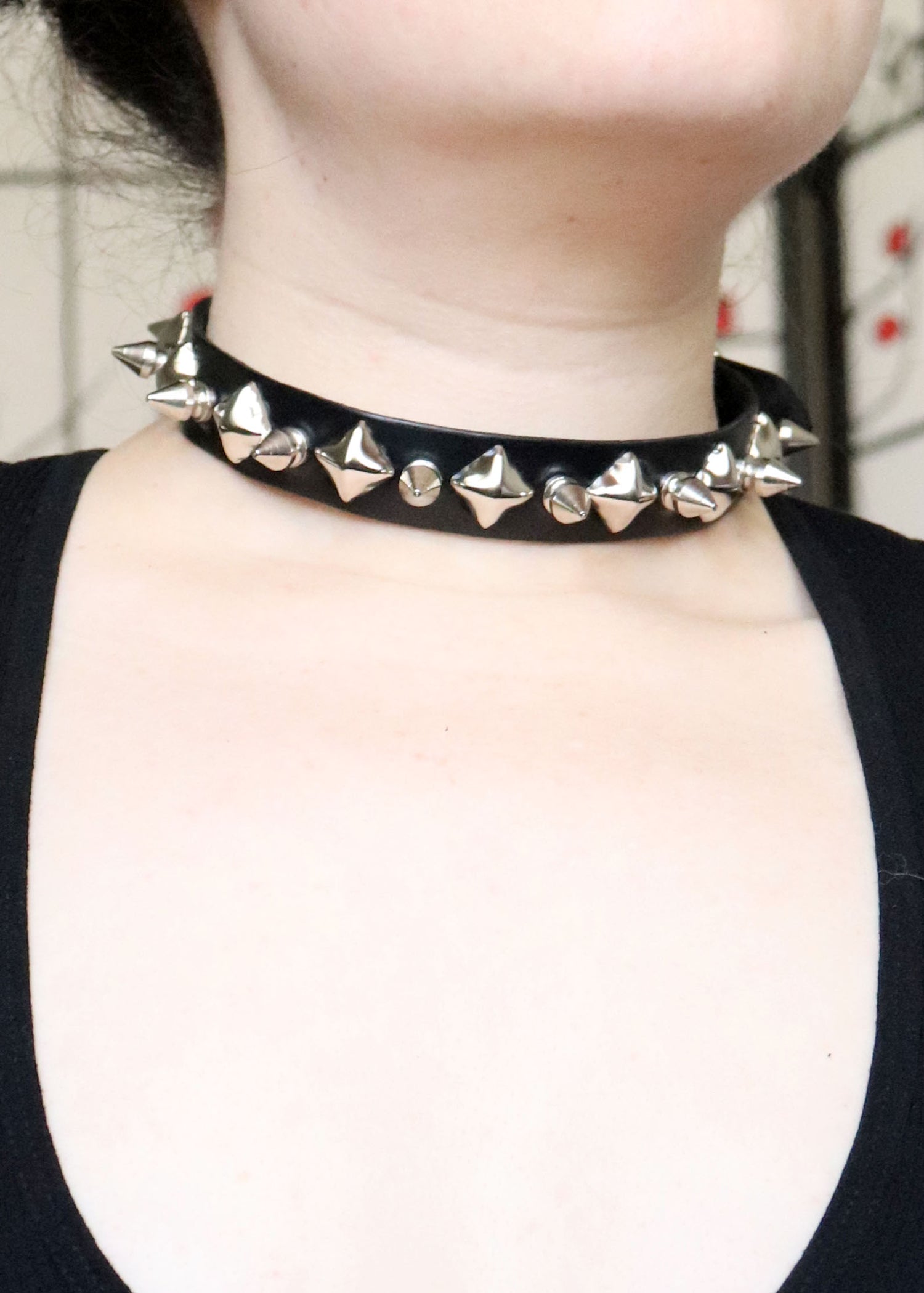 Black Leather Collar with Chrome Spikes and Pyramid Studs