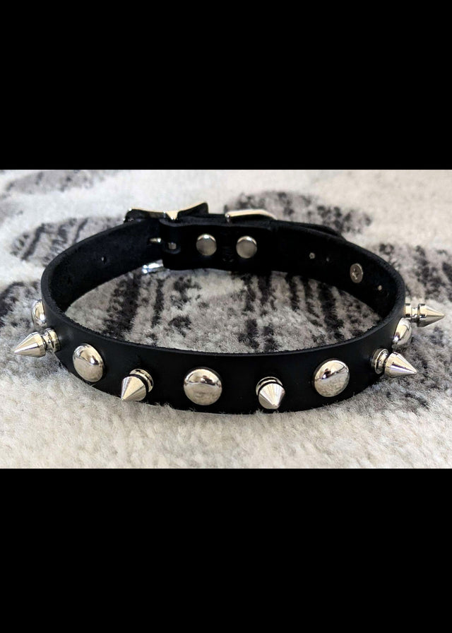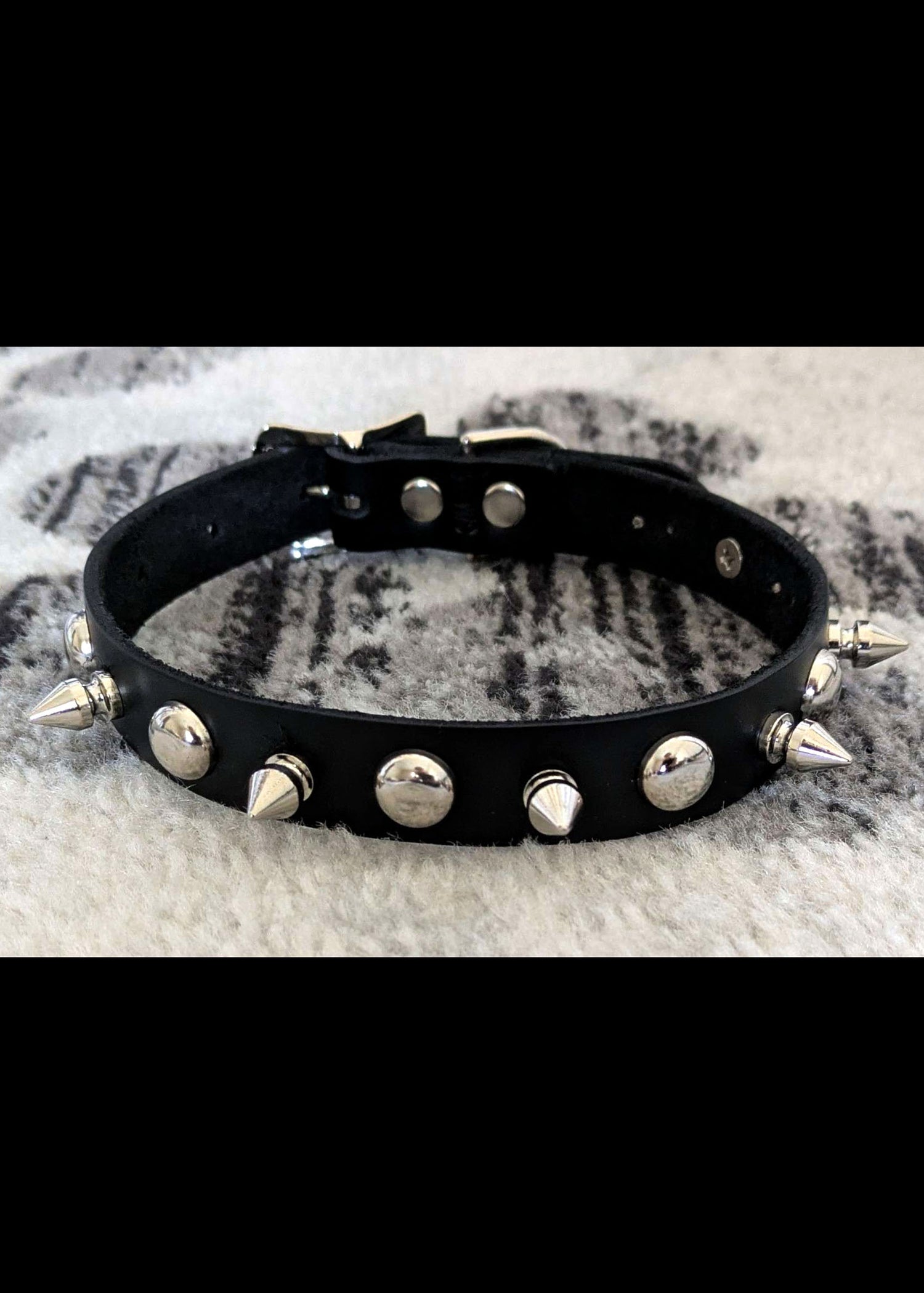 Black Leather Collar with Chrome Spikes and Round Studs - SM/MD is backordered and will ship as soon as it is back in stock.