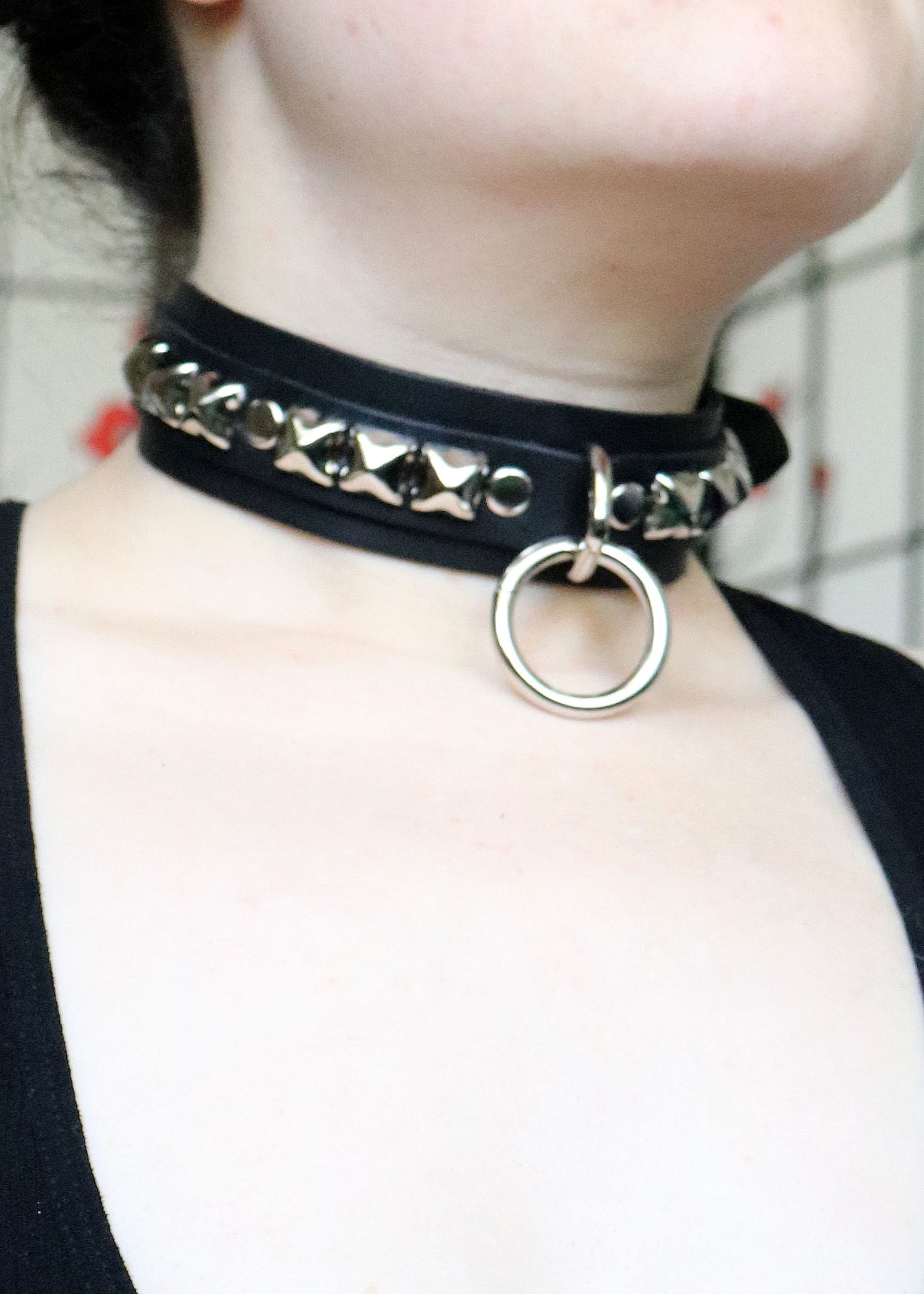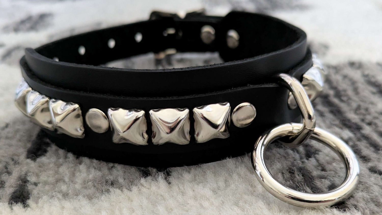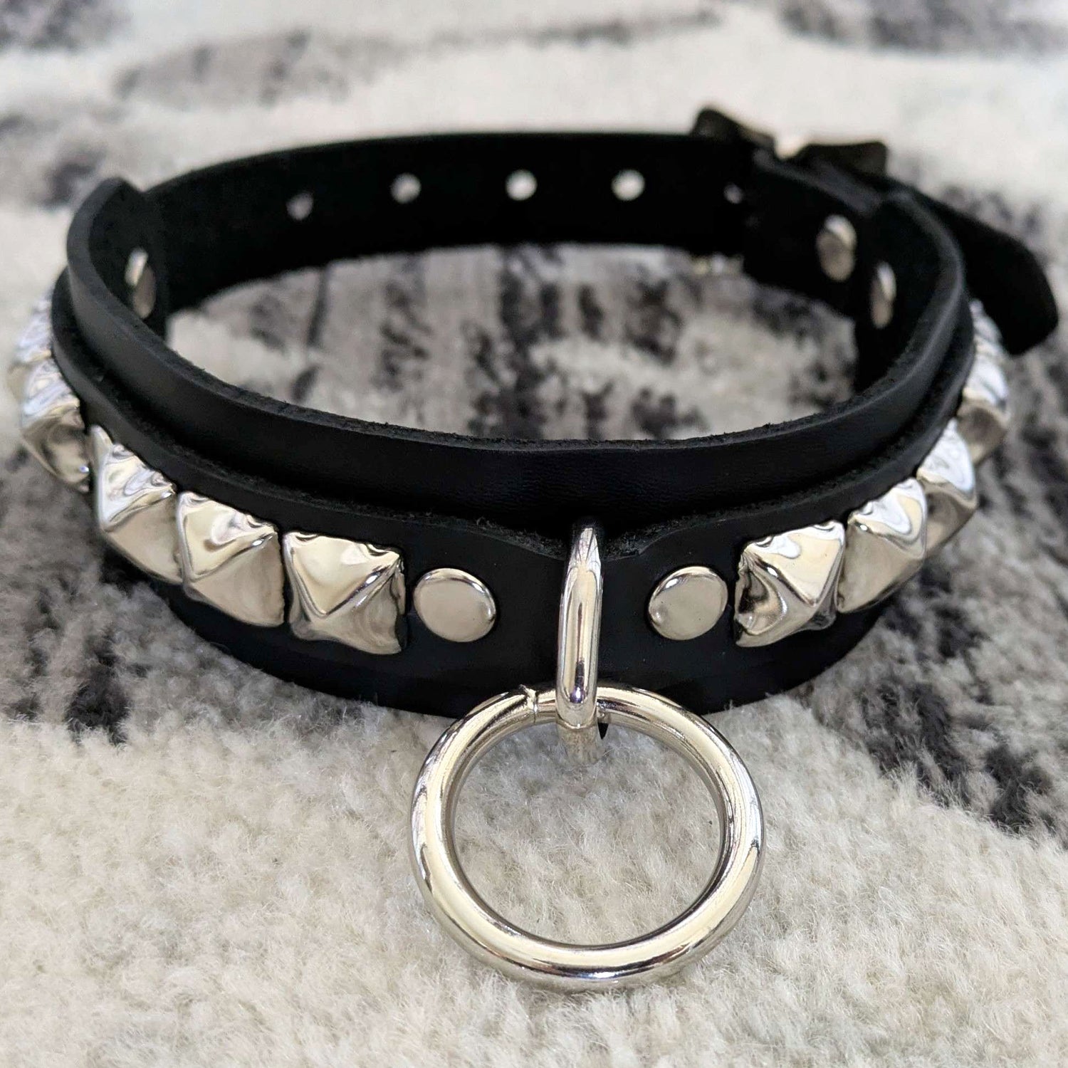 Black Leather Collar with Chrome Studs and Ring - SM/MD is backordered and will ship as soon as it is back in stock.