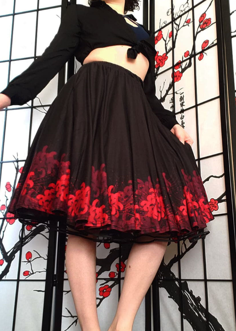 A black skirt laced with mysterious red spider lilies. These flowers are known by many other names such as corpse flower, resurrection flower, and magic lily.