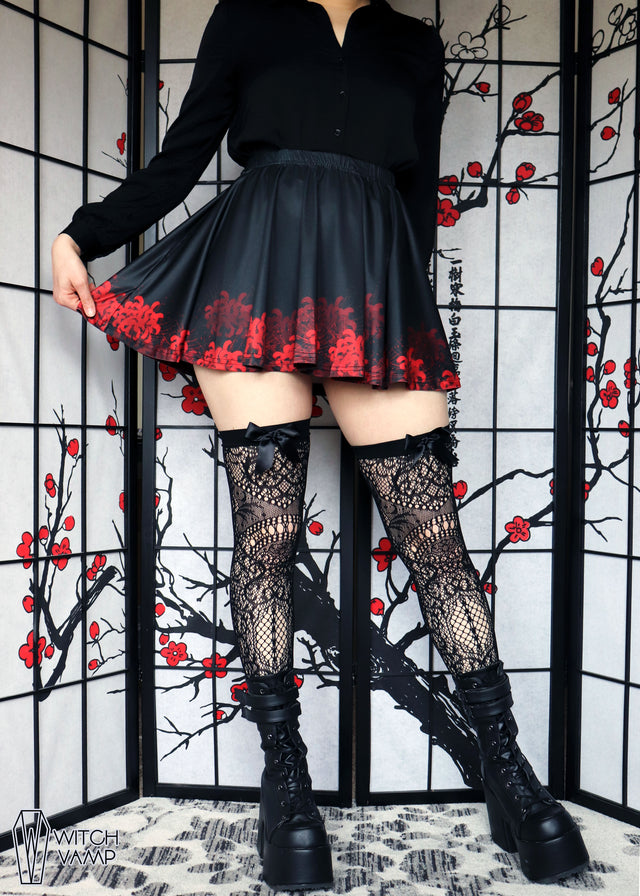 A black skirt laced with mysterious red spider lilies. These flowers are known by many other names such as corpse flower, resurrection flower, and magic lily.