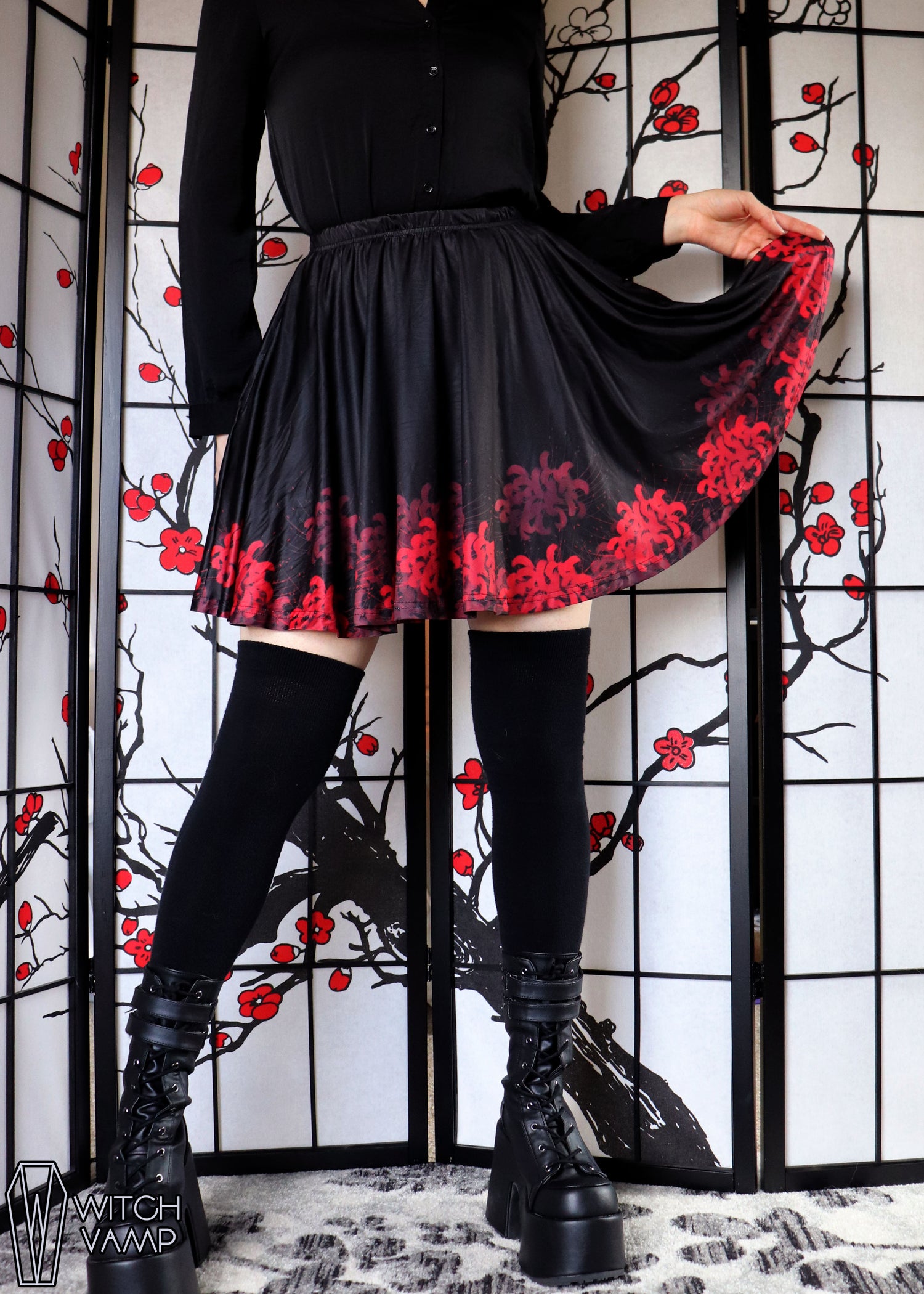 A black skirt laced with mysterious red spider lilies. These flowers are known by many other names such as corpse flower, resurrection flower, and magic lily.