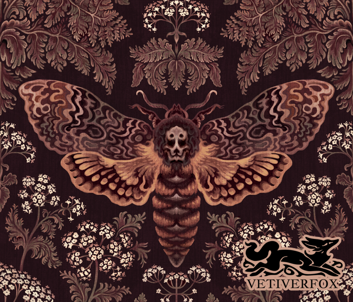 Death's Head Moth" features a dark, autumnal pattern by Vetiverfox