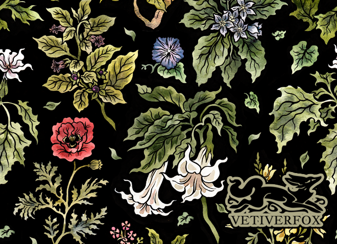 "Treacherous Garden" features a variety of deadly florals and plants painted in watercolor, by Vetiverfox