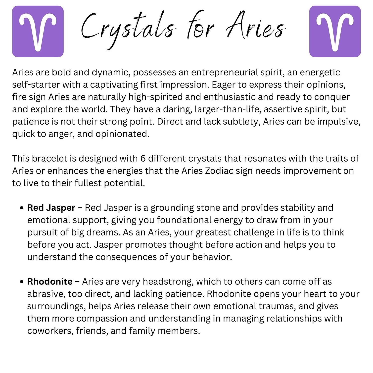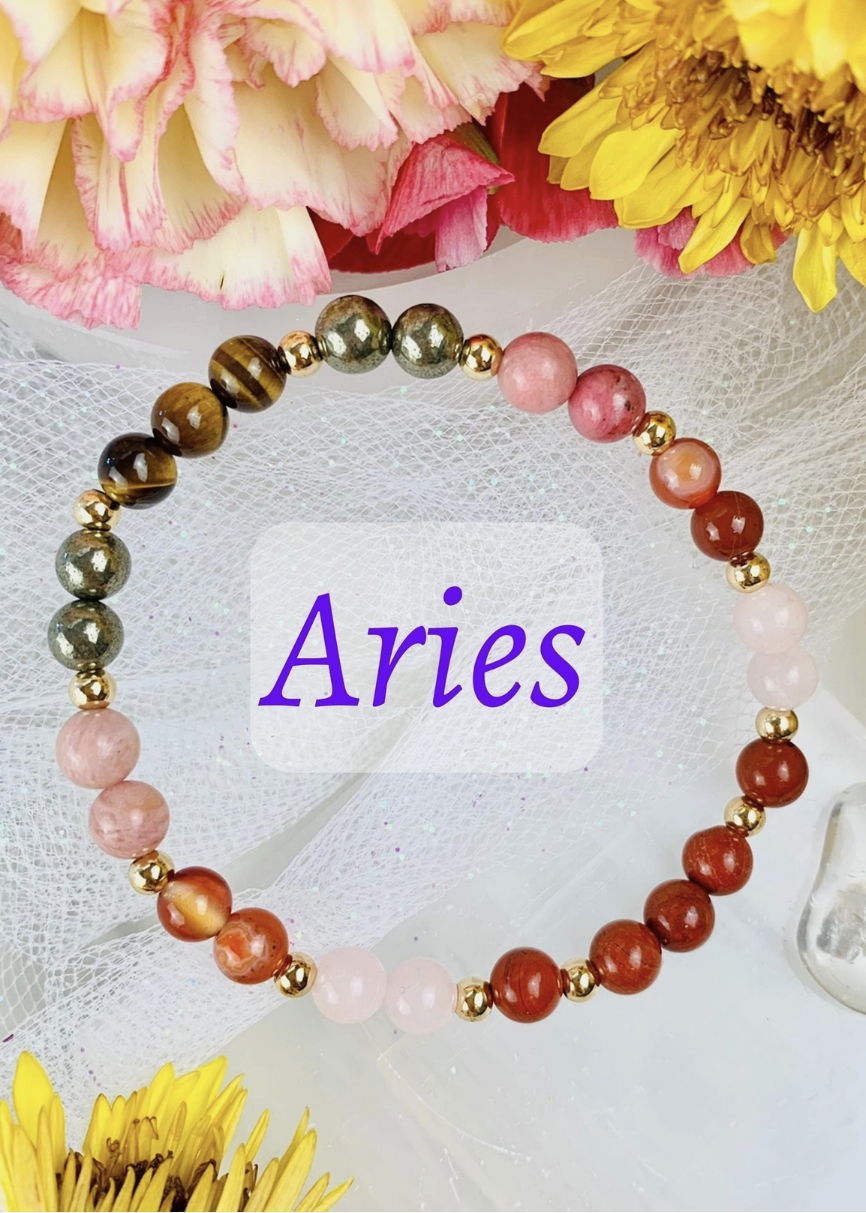 This bracelet is designed with 6 different crystals that resonate with the traits of Aries, or enhances the energies that the Aries Zodiac sign needs improvement on to live to their fullest potential. Comes with a card containing a short description of each crystal and their properties.*