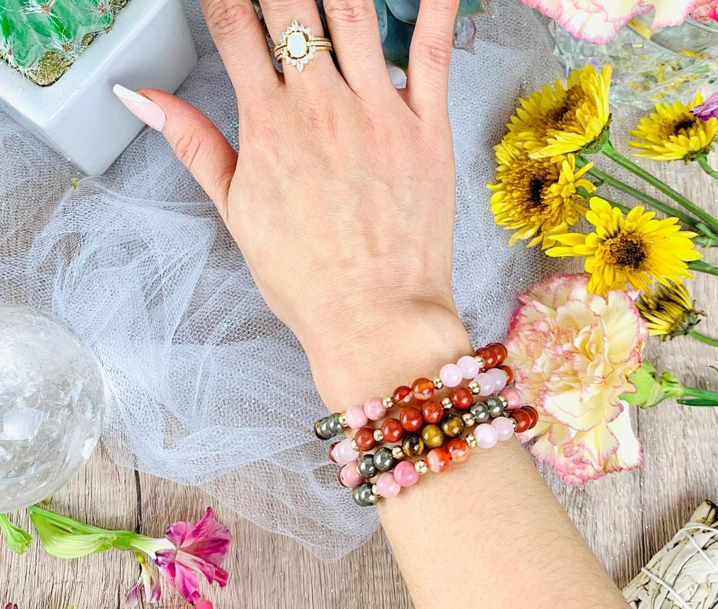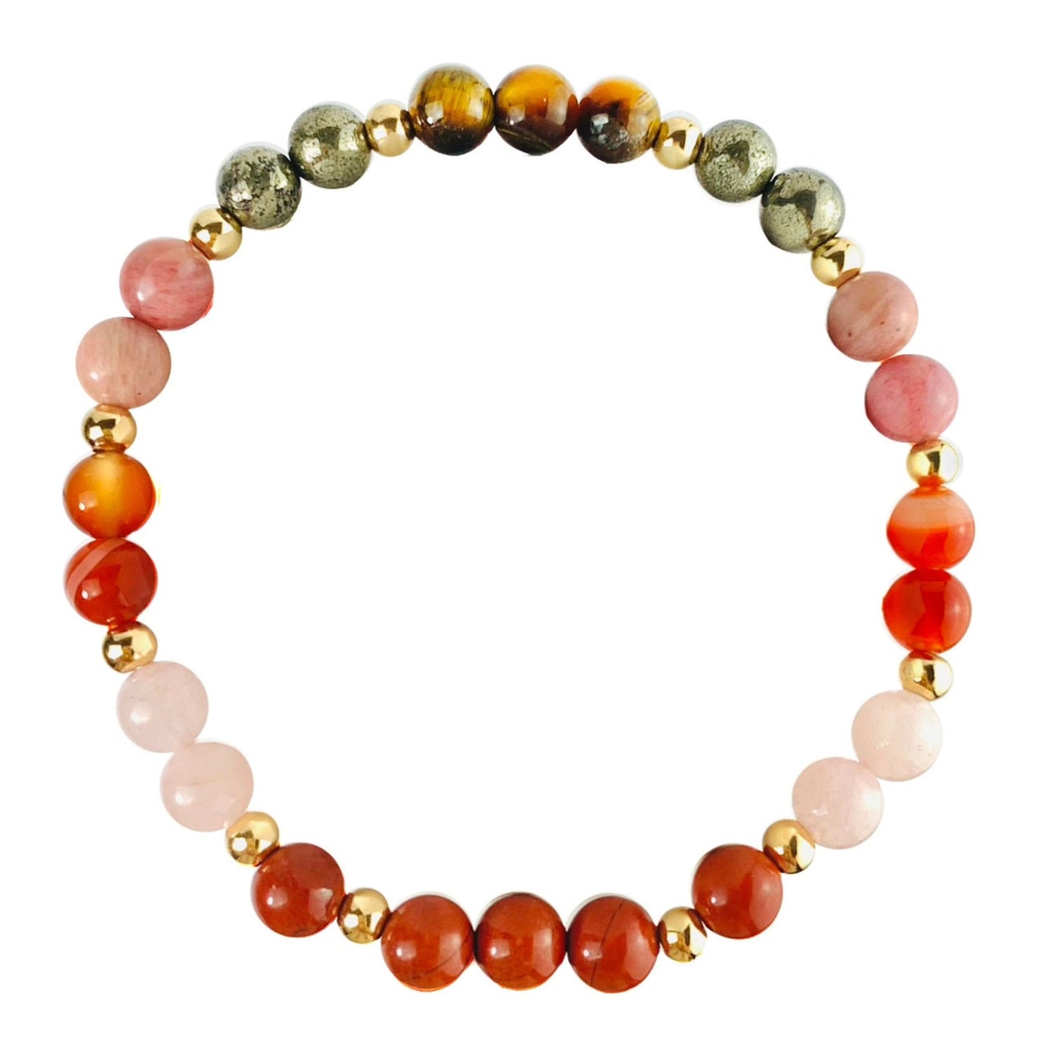 Gemstones included: Red Jasper, Rose Quartz, Carnelian, Rhodonite, Pyrite, Tiger Eye