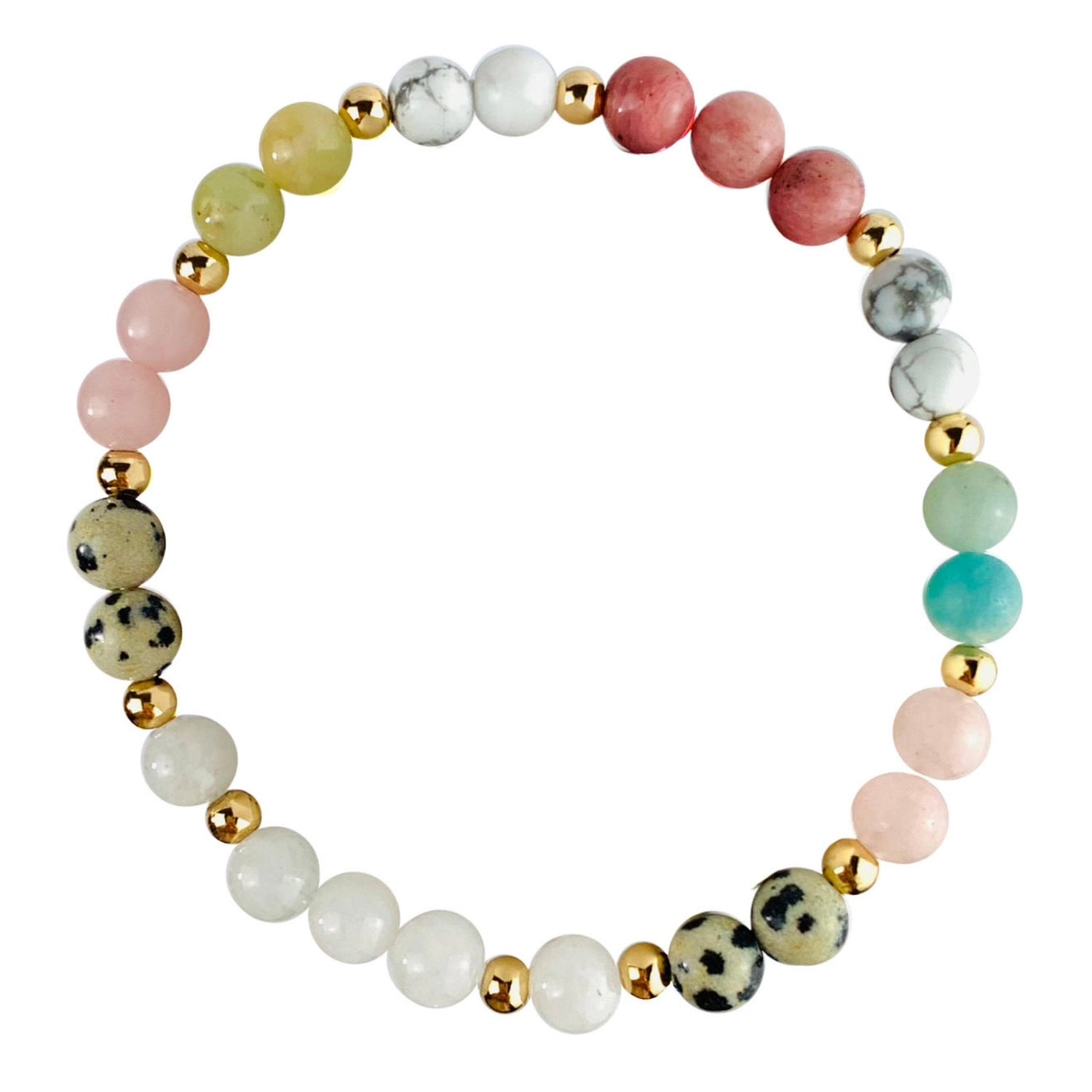Gemstones included: Moonstone, Dalmatian Jasper, Rose Quartz, Amazonite, Howlite, Rhodonite