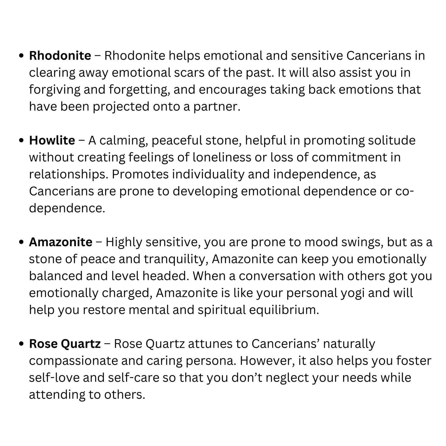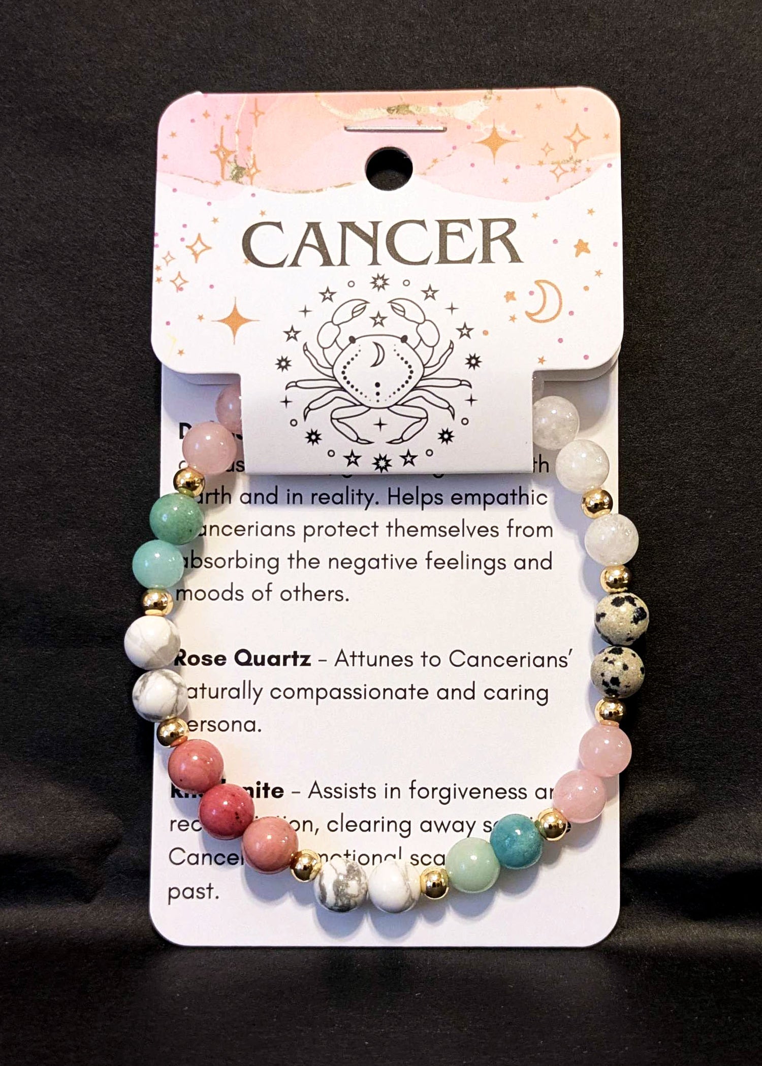 This bracelet is designed with 6 different crystals that resonate with the traits of Cancer, or enhances the energies that the Cancer Zodiac sign needs improvement on to live to their fullest potential. Comes with a card containing a short description of each crystal and their properties.*