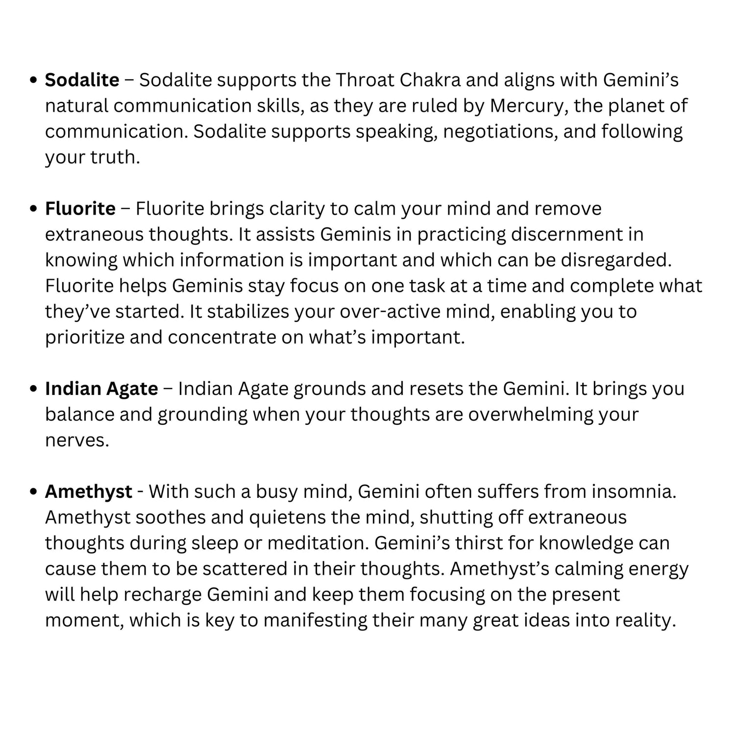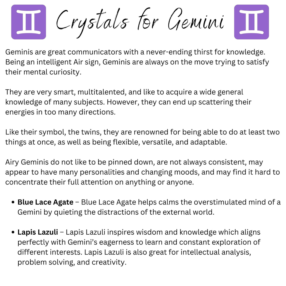 This bracelet is designed with 6 different crystals that resonate with the traits of Gemini, or enhances the energies that the Gemini Zodiac sign needs improvement on to live to their fullest potential. Comes with a card containing a short description of each crystal and their properties.*