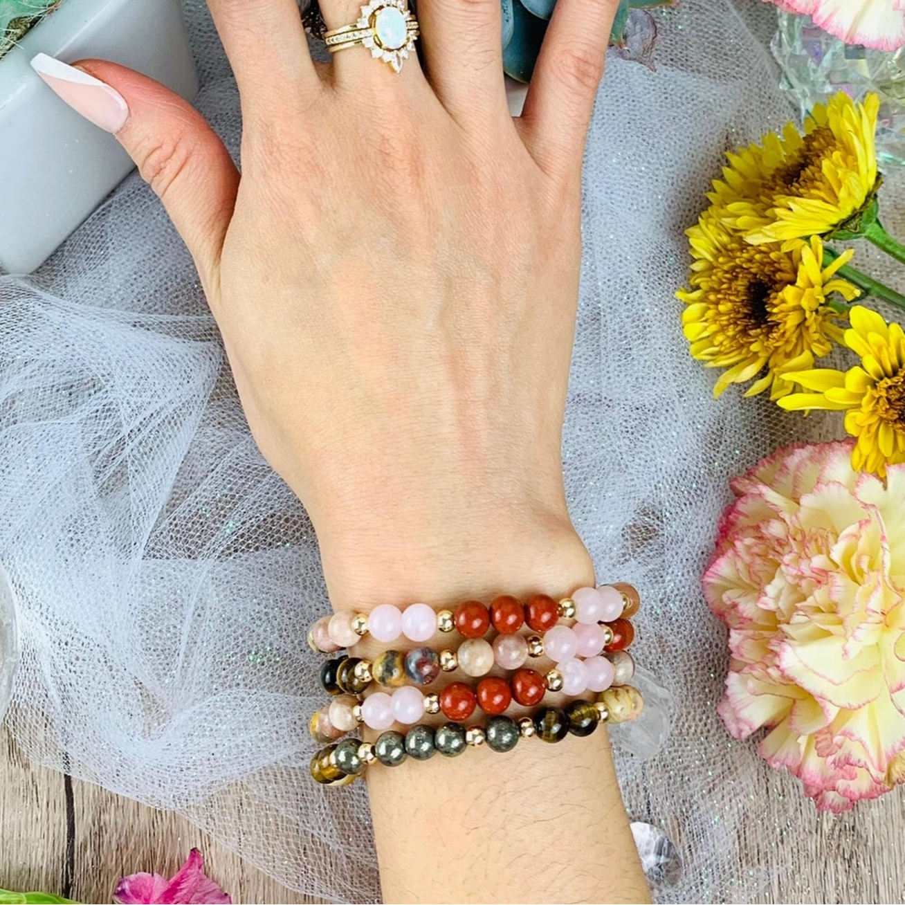 Gemstones included: Pyrite, Tiger Eye, Crazy Lace Agate, Sunstone, Rose Quartz, Red Jasper