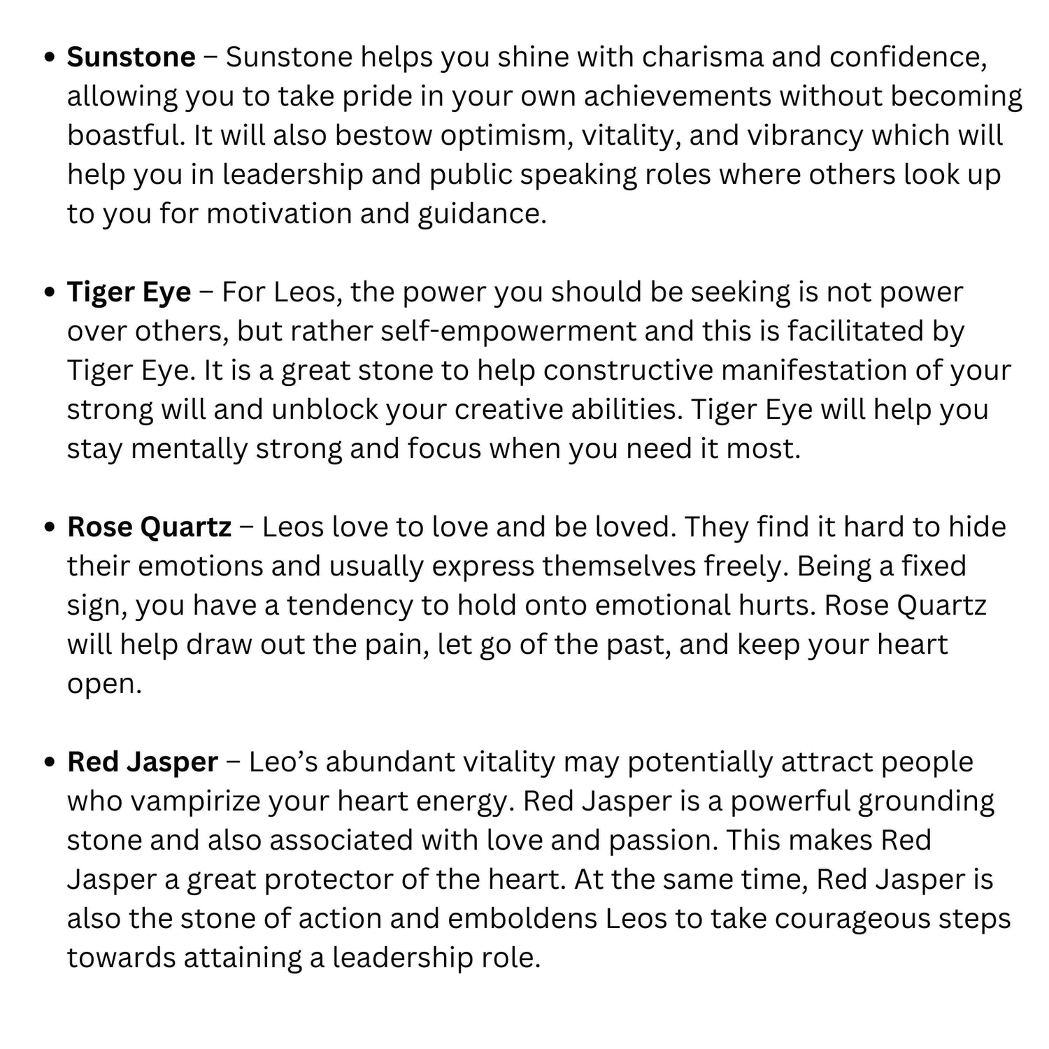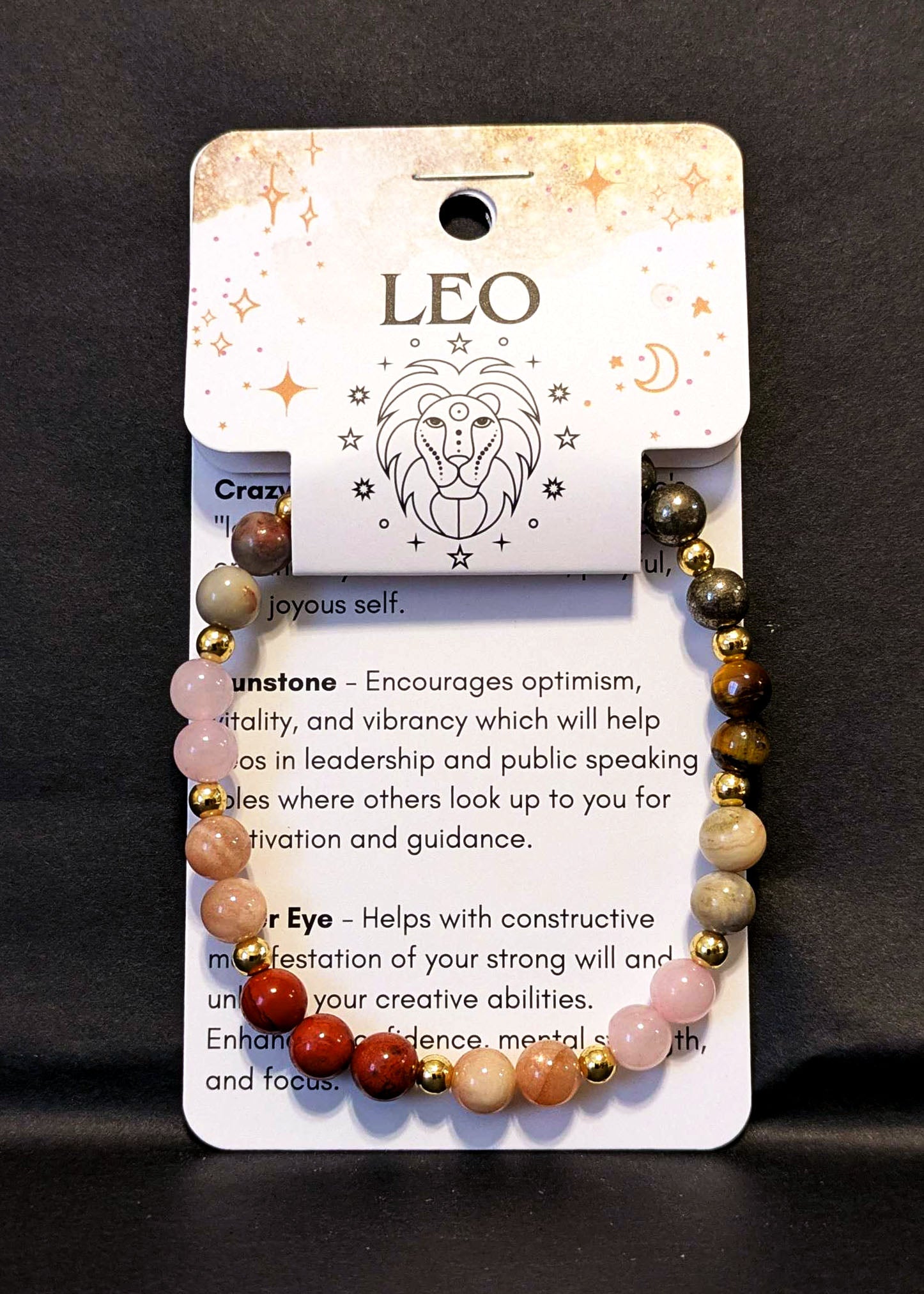 This bracelet is designed with 6 different crystals that resonate with the traits of Leo, or enhances the energies that the Leo Zodiac sign needs improvement on to live to their fullest potential. Comes with a card containing a short description of each crystal and their properties.*