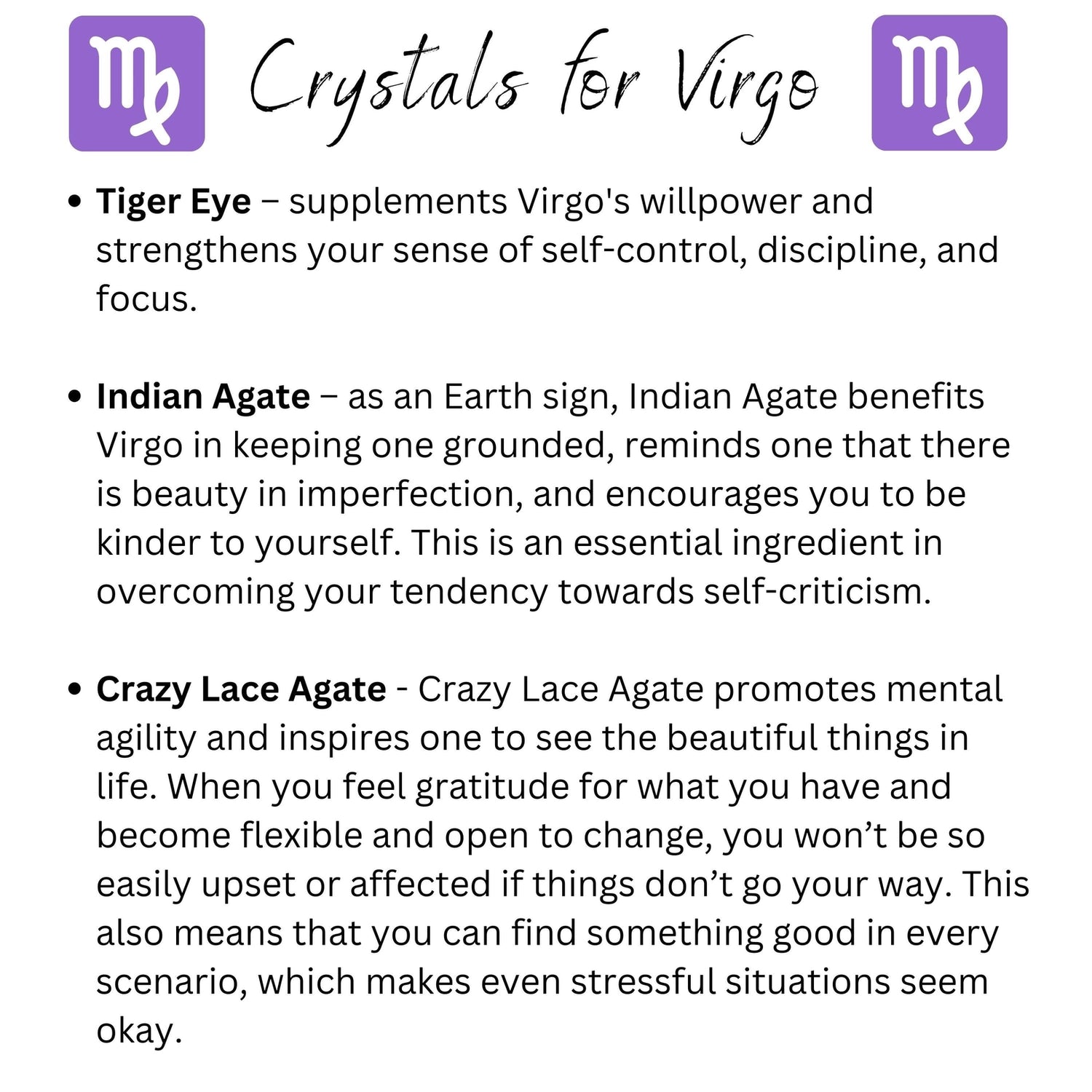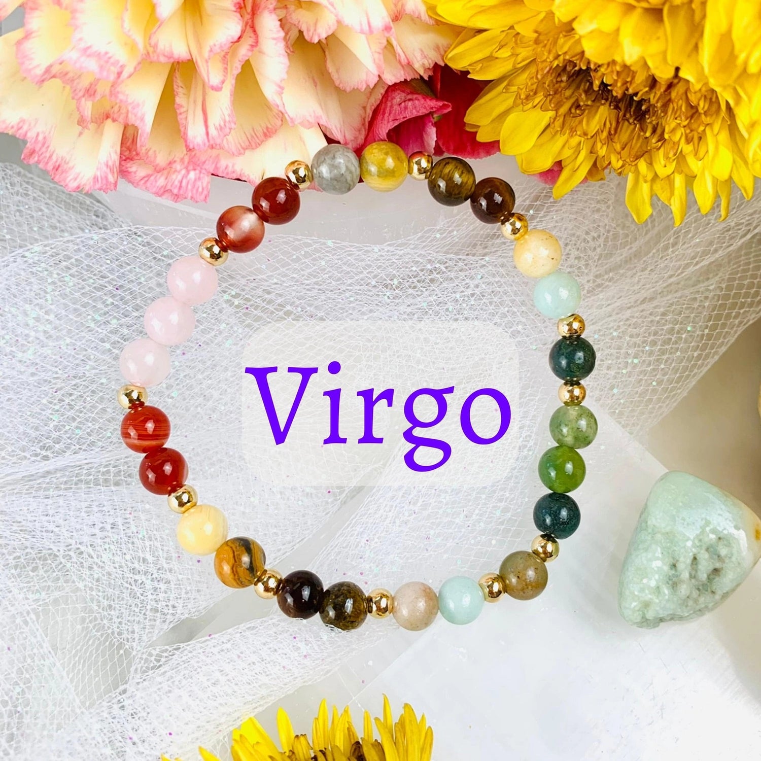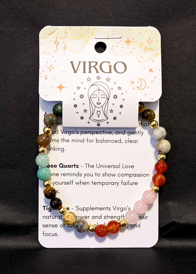 This bracelet is designed with 6 different crystals that resonate with the traits of Virgo, or enhances the energies that the Virgo Zodiac sign needs improvement on to live to their fullest potential. Comes with a card containing a short description of each crystal and their properties.*