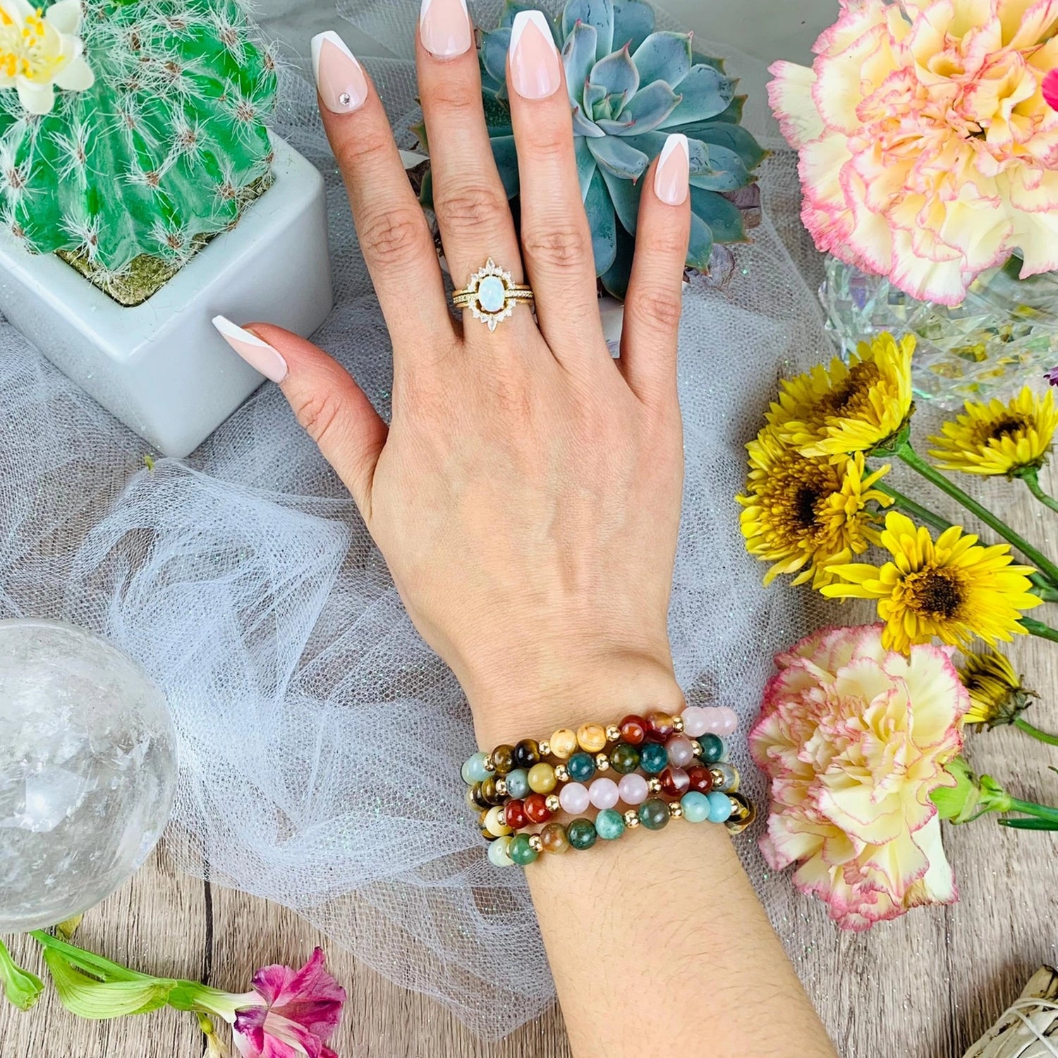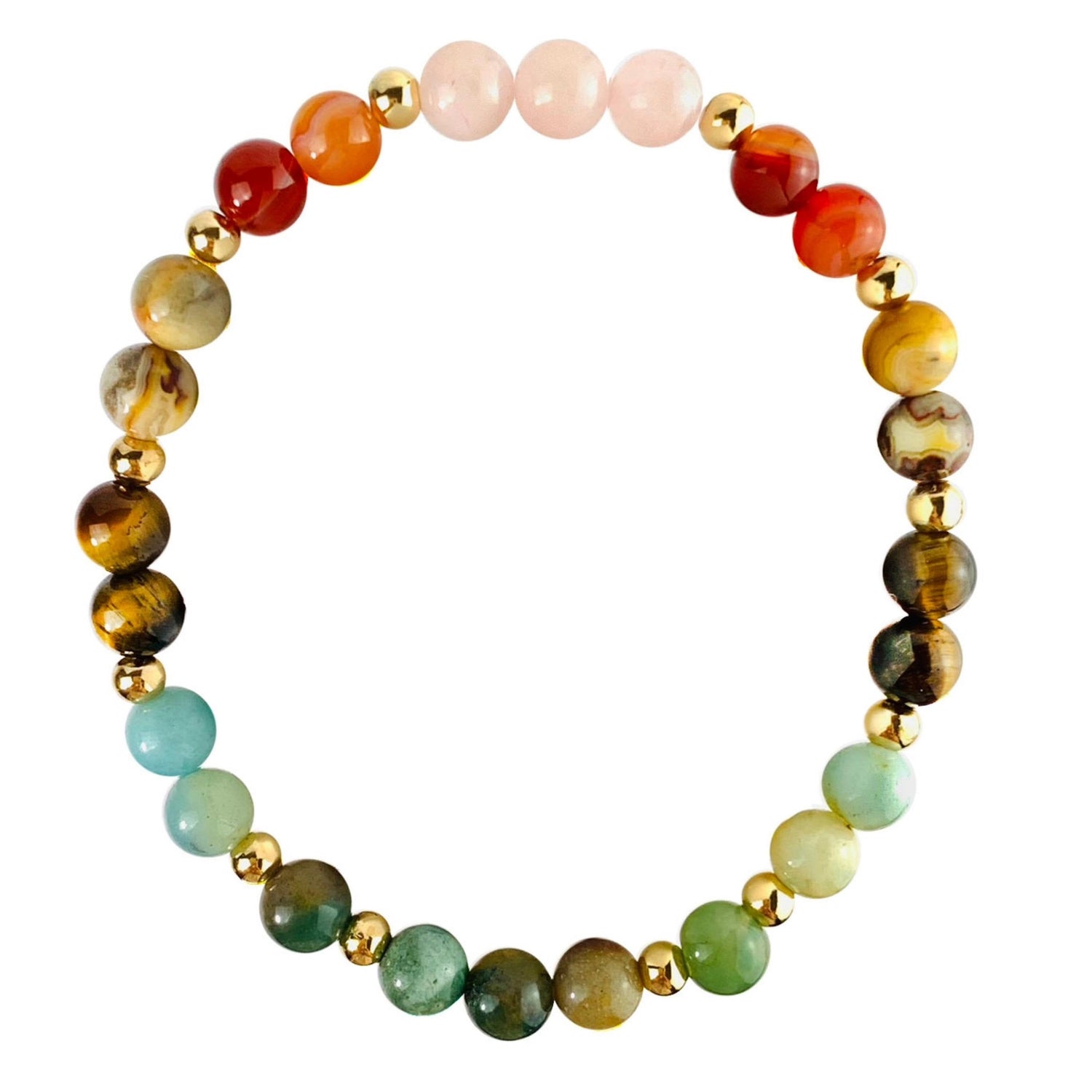 Gemstones included: Indian Agate, Amazonite, Tiger Eye, Crazy Lace Agate, Carnelian, Rose Quartz