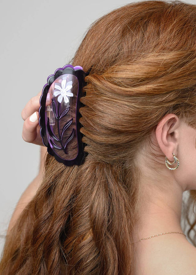 A ghostly white asphodel shines through a dark scalloped lace border. A flower connected to the underworld and closely associated with persephone, who is often depicted wearing a crown of Asphodels. The Asphodel Meadows are one of the three layers of the underworld, described as a vast field of flowers between heaven and hell inhabited by spirits. Our interpretation places the focal point on the Asphodel bloom, surrounding it with clear acetate, framed by a two toned black and deep purple scalloped border. This is a larger claw style, and works best for those with long or thick hair.